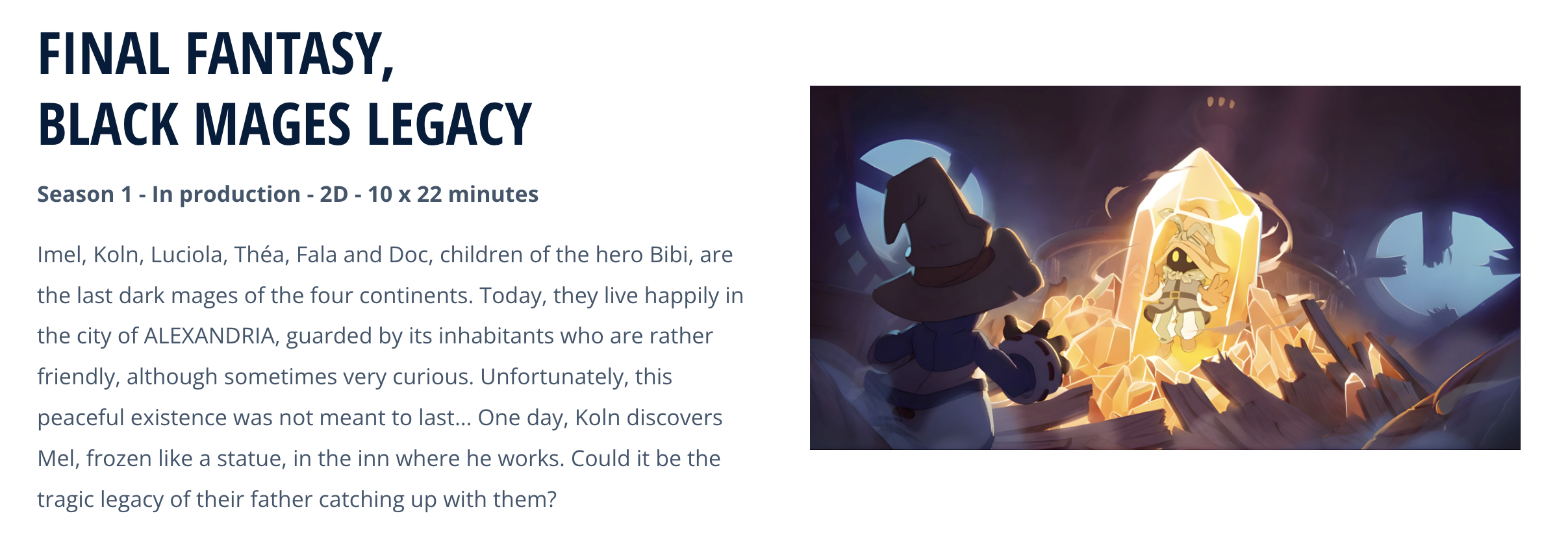 Dal punto di vista delle premesse, lo show racconta la storia di un gruppo di giovani Maghi Neri, descritti come figli di personaggi simili a Vivi, che vivono ad Alexandria dopo gli eventi del gioco originale. La storia si basa su un conflitto quando uno di loro scopre un compagno congelato sul posto.