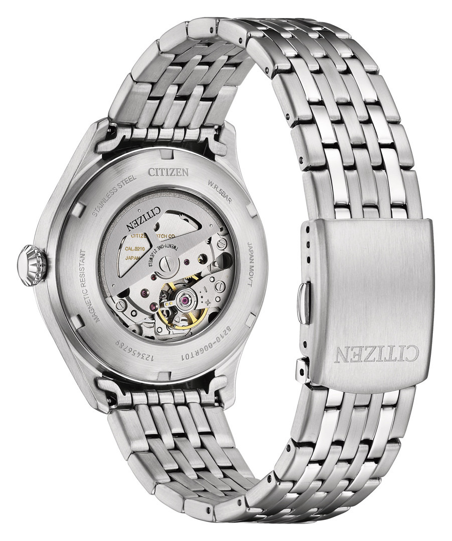 Il modello NJ0240-55L monta un movimento automatico Calibro 8210. Si tratta di un movimento meccanico interno molto utilizzato da Citizen, che funziona a 21.600 vibrazioni all'ora con una riserva di carica dichiarata di circa 40 ore. La cassa misura 40 mm di diametro e 11,6 mm di spessore, il che significa che rientra nelle proporzioni standard per un orologio da indossare tutti i giorni. Sia la cassa che il bracciale sono realizzati in acciaio inossidabile, con un vetro minerale sul lato anteriore. L'orologio offre anche una resistenza all'acqua di base fino a 50 metri. Altri elementi funzionali includono il datario.