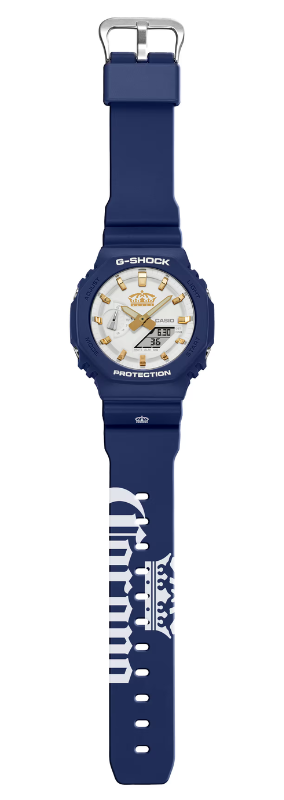 Il G-Shock GA-2100CR25-2A ha un quadrante bianco con accenti in oro, come gli indici e le due lancette analogiche. Inoltre, l'icona della corona Corona è stampata in oro sul quadrante e in bianco sul cinturino. L'orologio ha una lunetta, una cassa e un cinturino in resina blu, con quest'ultimo che presenta anche il logo del marchio in bianco.