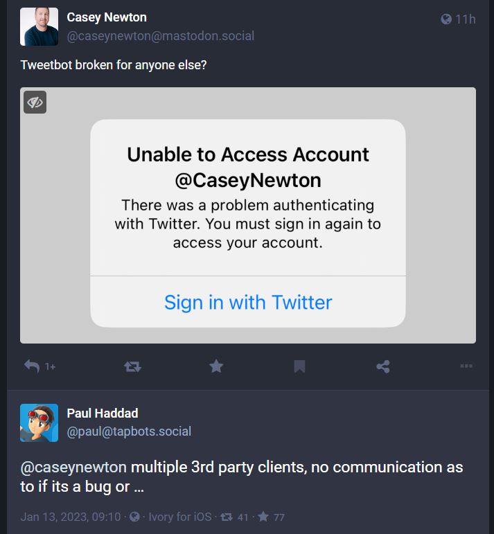 È interessante notare che sembra che solo i client di Twitter veri e propri stiano riscontrando problemi, in quanto i servizi/applicazioni che usano Twitter API di Twitter in modo limitato, ad esempio per l'autenticazione, non hanno avuto problemi https://twitter.com/tcarmody/status/1613753207783661569?ref_src=twsrc%5Etfw. Tenendo conto di ciò, si ipotizza che Twitter stia deliberatamente sospendendo l'accesso dei client di terze parti alla piattaforma, soffocando le applicazioni nel processo.