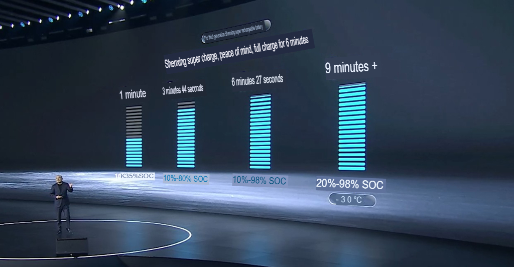 Grazie a diverse innovazioni, come l'aumento dell'efficienza di raffreddamento del 20%, per esempio, la batteria di Shenxing 3 LFP si carica dal 10% al 35% in un solo minuto, raggiunge l'80% in 3 minuti e 44 secondi e il 98% in 6 minuti e 27 secondi, per una velocità di carica sostenuta di 10C che, secondo CATL, può raggiungere un picco di 15C durante le prime fasi della carica.