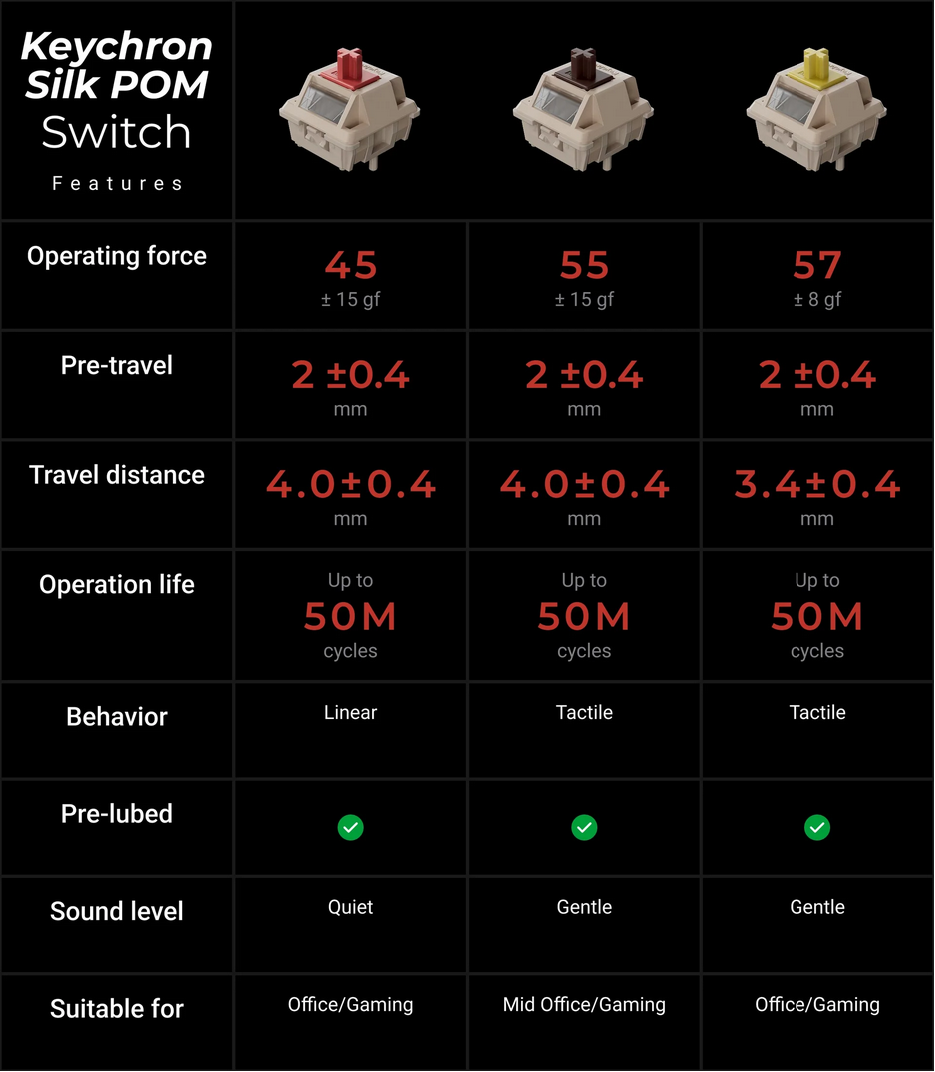 | Opzioni interruttore predefinite | Keychron Silk POM Rosso (lineare), Marrone (tattile), Banana (tattile forte) | ||