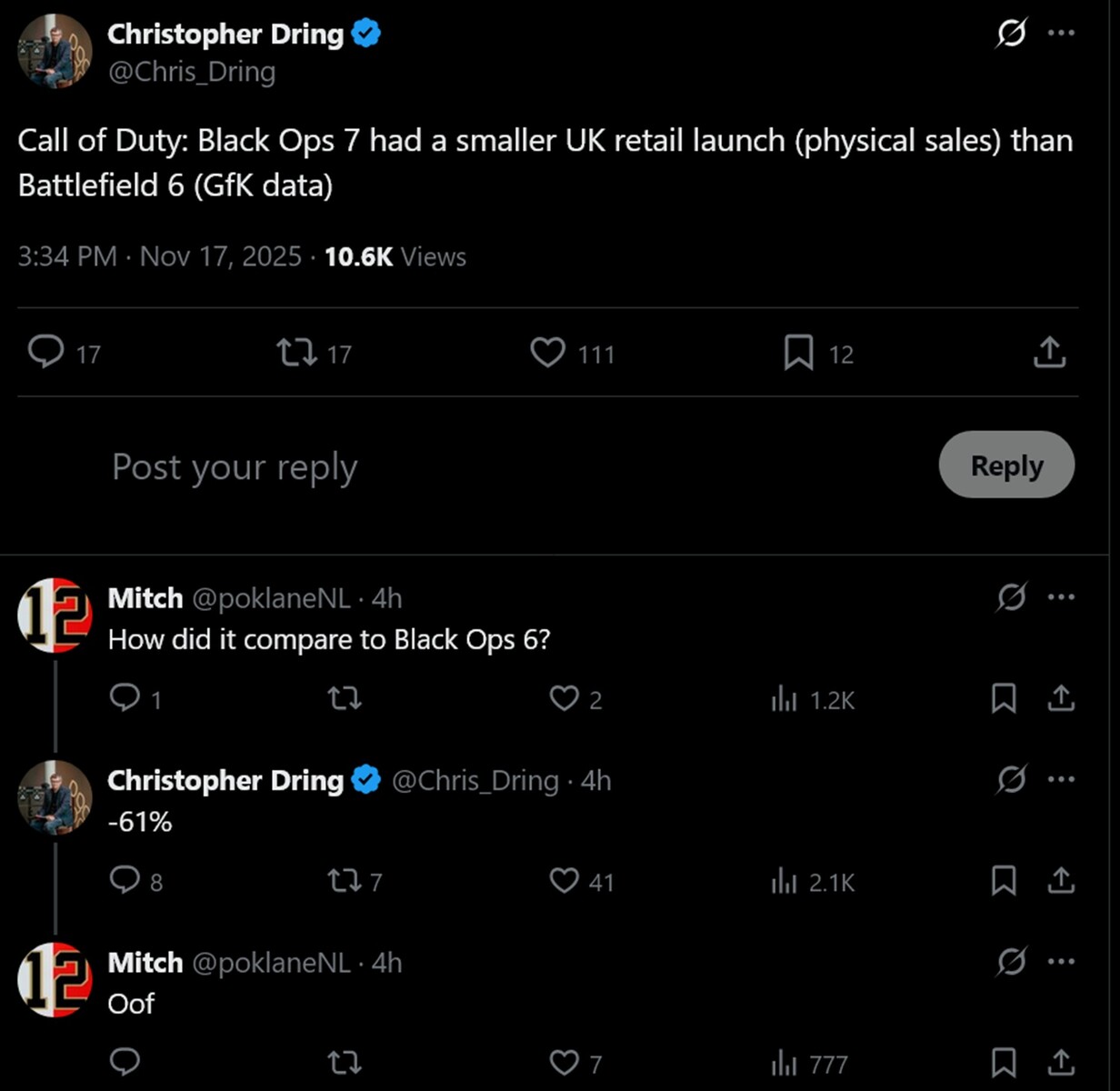 Christopher Dring di The Game Business ha rivelato le prime statistiche sui social media. Le cifre esatte non sono state fornite, ma Dring ha rivelato che l'ultimo gioco di Call of Duty sta giocando alla pari con il suo rivale EA. Anche le vendite di Black Ops 7 sono significativamente inferiori a quelle delle versioni precedenti della serie.