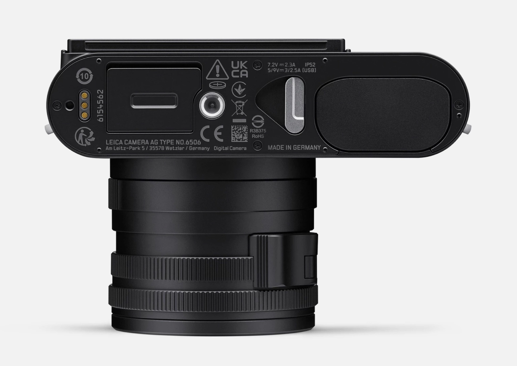 Il design in questa immagine presenta due vantaggi rispetto alla Leica M11. In primo luogo, il cursore che sgancia la batteria dal corpo macchina può essere azionato più facilmente nella sua nuova posizione, mentre una piastra a sgancio rapido è fissata alla fotocamera. In secondo luogo, Leica aggiunge tre contatti metallici per gli accessori. Sulla Leica Q3, questi sono utilizzati per un'impugnatura che consente alla fotocamera di caricarsi in modalità wireless su un pad di ricarica Qi.