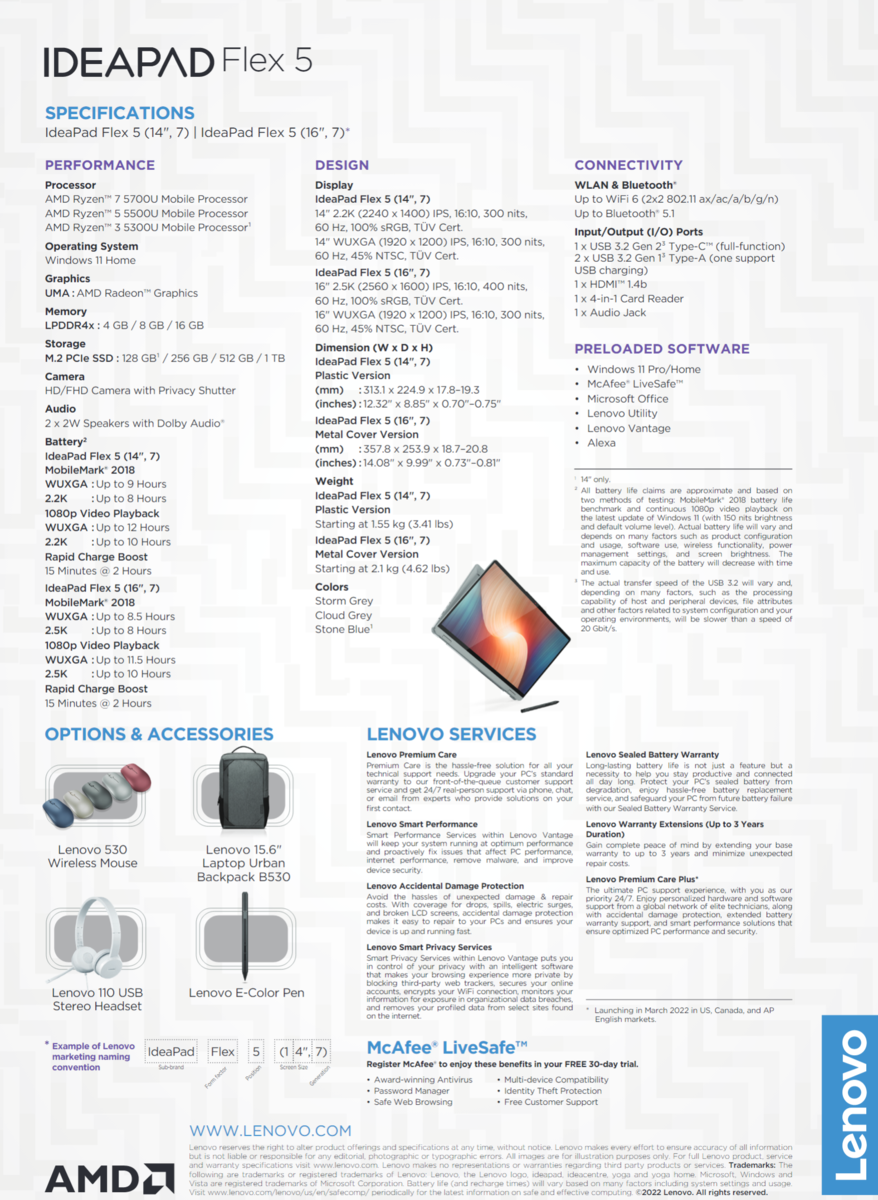 Lenovo ha presentato l'IdeaPad Flex 5, uno dei tre portatili della serie Flex 5 che l'azienda ha presentato al MWC 2022. Disponibile in dimensioni di schermo da 14 e 16 pollici, il Flex 5 viene anche fornito con una scelta di tre processori AMD Ryzen serie 5000U e diverse opzioni di visualizzazione.
