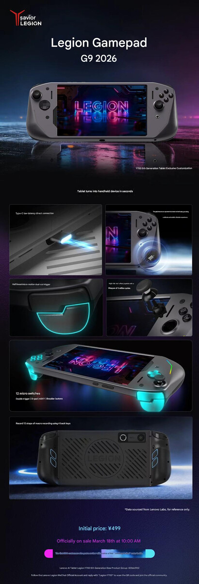Legion G9 2026 è ufficialmente compatibile solo con Legion Y700 Gen 5 tramite la porta USB Type-C laterale del tablet. Tuttavia, il controller dovrebbe funzionare anche con Legion Tab Gen 5. Tuttavia, Lenovo non ha chiarito se Legion G9 2026 sarà venduto a livello globale. Come riferimento, Lenovo ha fissato il prezzo del suo nuovo controller a CNY 499 (~$73) in Cina.