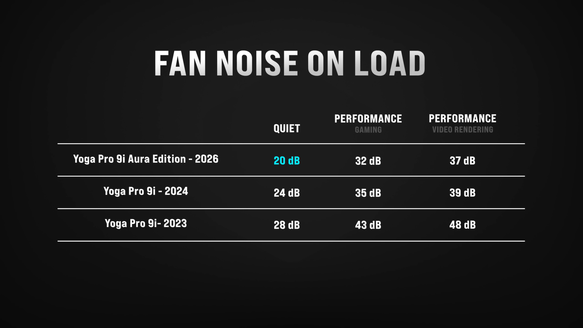 Inoltre, il 2026 Lenovo Yoga Pro 9i Aura Edition secondo quanto riferito, è anche molto più silenzioso nella modalità "Performance" durante il gioco (32 db) e il rendering video (37 db). Il 2024 Yoga Pro 9iper esempio, produce 35 db di rumore durante il gioco e 39 db durante il rendering video.