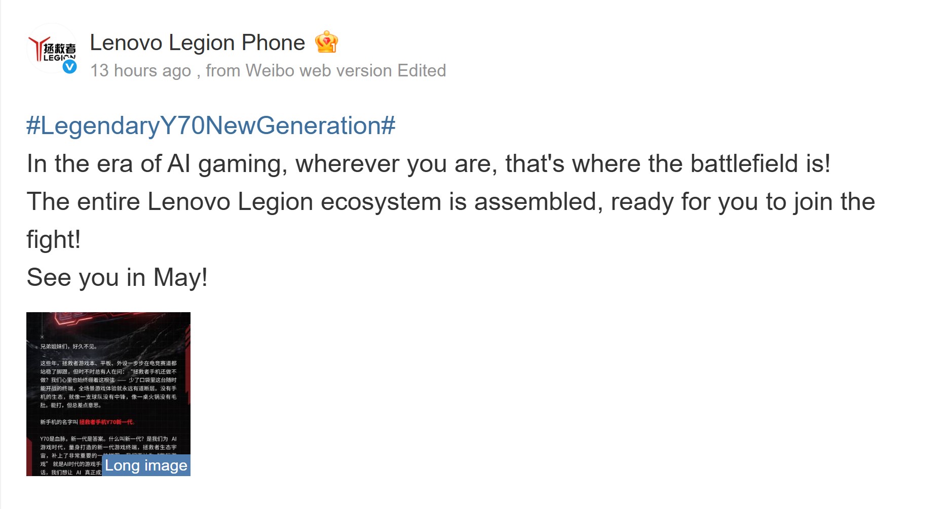 Con un annuncio non del tutto inaspettato, l'azienda ha confermato che annuncerà presto un nuovo telefono da gioco Legion. Il marchio non ha condiviso molto, ma ha lasciato intendere che il lancio è previsto per maggio 2026.