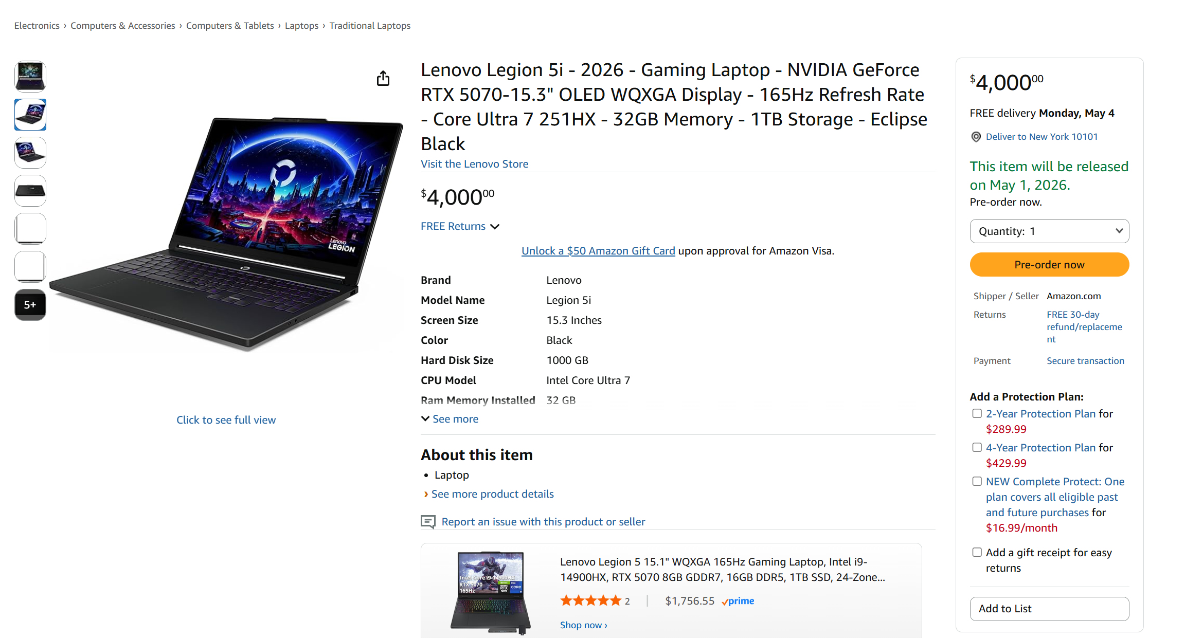Nel frattempo, l'utente X Huang514613 ha avvistato diverse versioni in vendita su Cendirect Canada e su Amazon US a 4.000 dollari. Come mostra l'immagine qui sotto, Lenovo ha elencato il modello Legion 5i con un display OLED da 15,3 pollici, 1 TB di spazio di archiviazione e 32 GB di RAM in una finitura Eclipse Black. In altre parole, questo corrisponde all'hardware delle varianti Panther Lake esistenti.