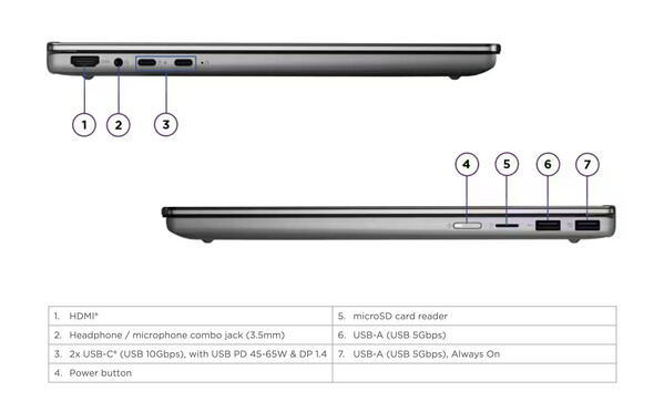 Attualmente, il portatile può essere configurato solo con il Core Ultra 7 355un processore a 8 core con un TDP di 25 W e un'iGPU a 4 core iGPU a 4 core. Inoltre, Lenovo offre 16 GB o 32 GB di RAM e 512 GB o 1 TB di storage. Inoltre, si può optare per un pannello IPS da 1200p o un equivalente OLED da 2,5K che offre fino a 1.100 nit in modalità HDR con una frequenza di aggiornamento di 165 Hz.