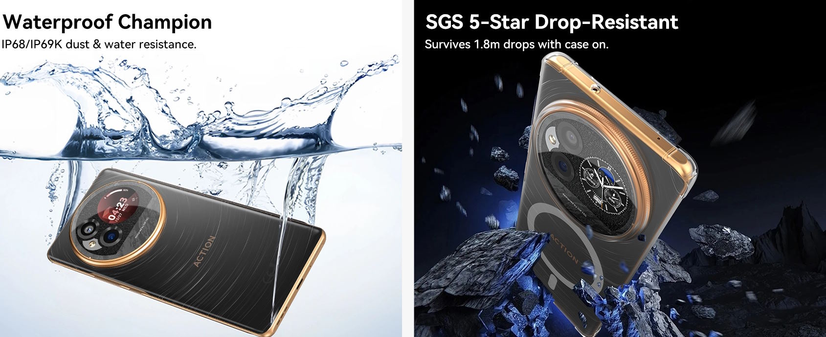 L'Action 15Pro è alimentato da un MediaTek Helio G100, un SoC a cui manca il supporto 5G. È dotato di 8 GB di memoria e 256 GB di archiviazione interna, espandibile tramite una scheda di memoria. L'azienda afferma che il telefono rugged offre una resistenza all'acqua e alla polvere con classificazione IP68 e IP69K ed è stato testato per resistere a cadute da 1,8 m (5,9 piedi). Il display principale AMOLED da 6,78 pollici vanta una risoluzione di 2.400 x 1.080 pixel e una frequenza di aggiornamento massima di 120 Hz. Altre caratteristiche degne di nota sono un sensore di impronte digitali sotto il display e una batteria da 5.100 mAh che supporta una ricarica a 30 watt, decente ma non eccezionalmente veloce.