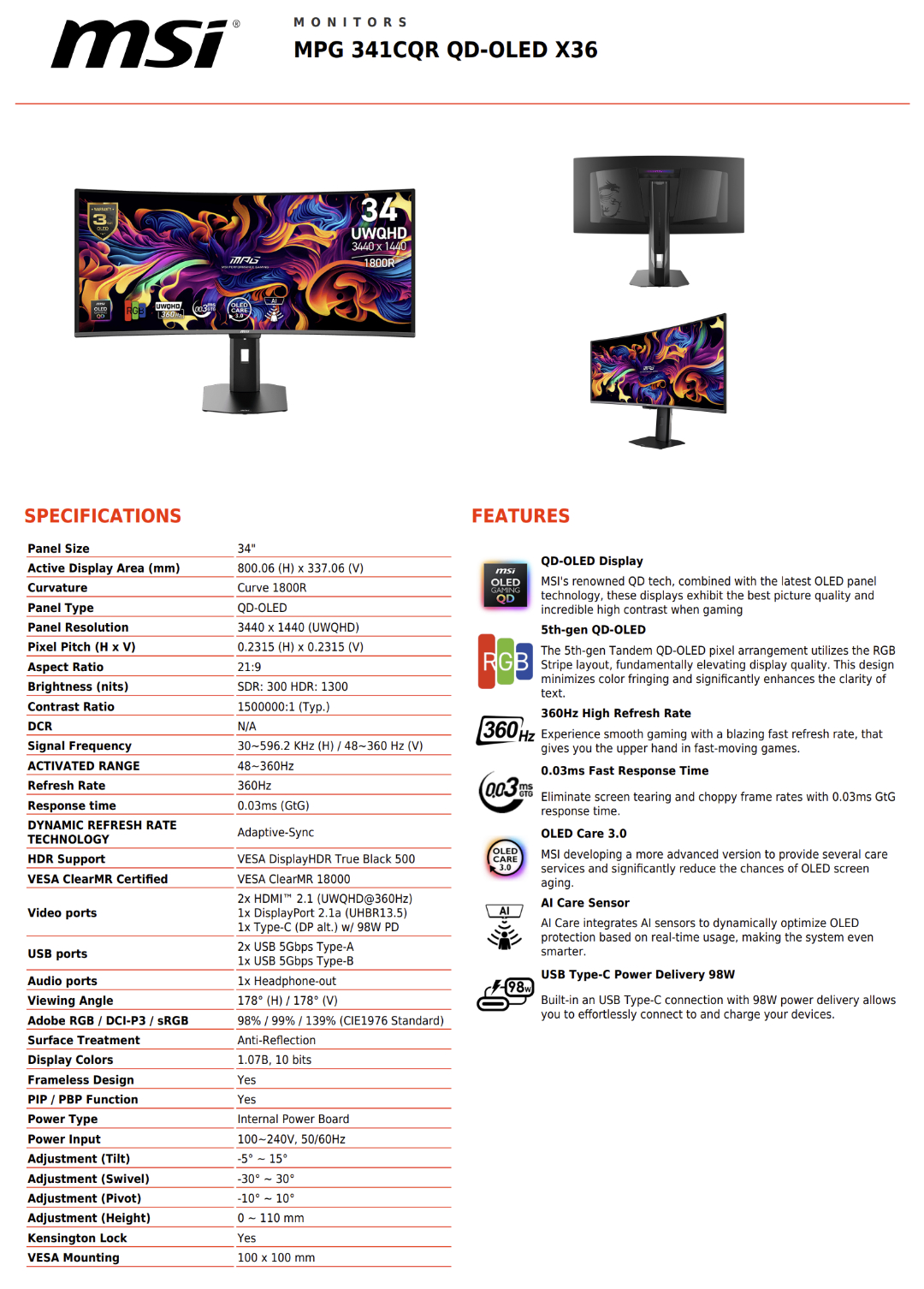 MSI MPG 341CQR QD-OLED X36 è un altro dei primi esempi della più recente tecnologia dei pannelli QD-OLED di Samsung Display. Attualmente, anche Acer, Asus e HP hanno sfruttato questo pannello Gen 5. In altre parole, MPG 341CQR QD-OLED X36 condividerà le stesse caratteristiche di base di Predator X34 FE, HyperX Omen 34 pollici OLED 360 Hz Gaming Monitor e il ROG Swift OLED PG34WCDNche sono i seguenti: