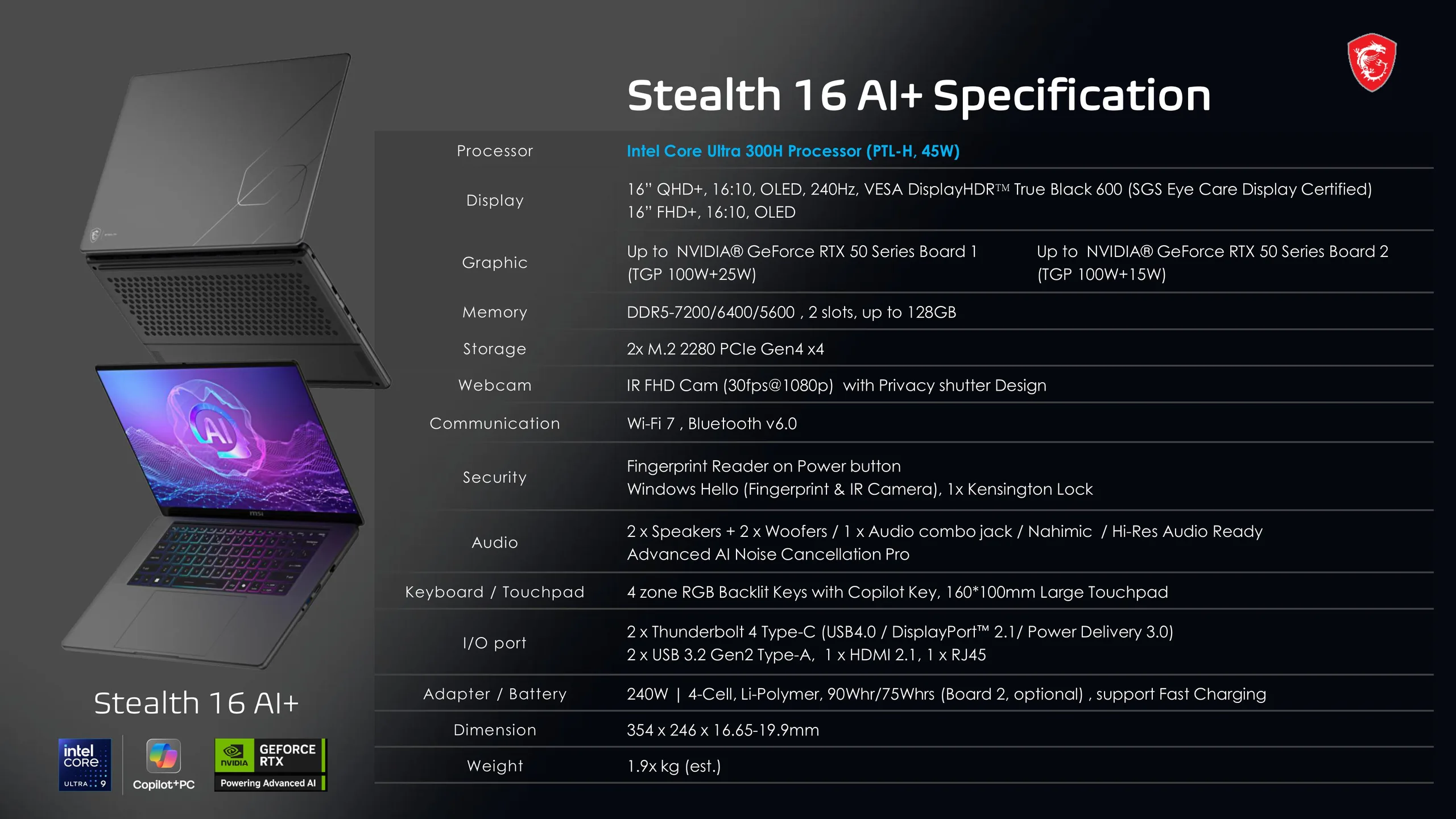 Gli acquirenti possono configurare Stealth 16 AI+ con un massimo di 128 GB di RAM DDR5-5600/6400/7200 e 2x unità M.2 NVMe PCIe Gen 4. Sono presenti anche una webcam IR FHD con un otturatore per la privacy e un lettore di impronte digitali sul pulsante di accensione, Wi-Fi 7, Bluetooth 6, una configurazione a quattro altoparlanti e una tastiera RGB a 4 zone con un touchpad da 160 x 100 mm.