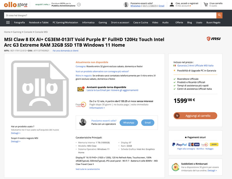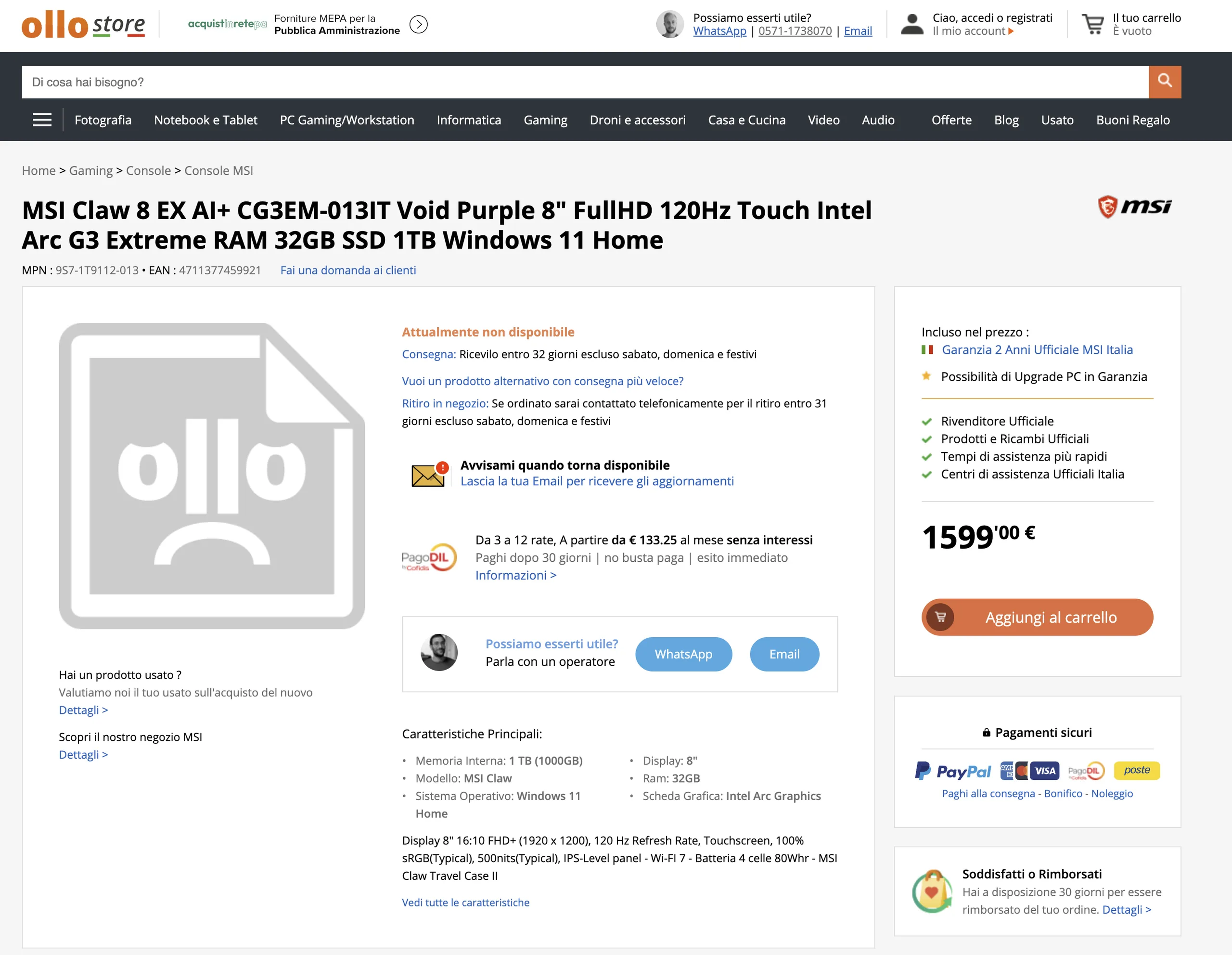 Inoltre, Ollo Store ha fissato il prezzo dell'inedito portatile di MSI a 1.599 euro (~$1.869). Sebbene sia un prezzo elevato, questo prezzo è superiore di soli 20 euro rispetto a quello che Lenovo applica ora per il modello Ryzen Z2 della versione Legion Go 2. Inoltre, Ollo Store suggerisce che il Claw 8 EX AI+ sarà disponibile in una finitura 'Void Purple'. Per coincidenza, MSI ha mostrato un portatile viola soprannominato 'Polar Void' durante il CES 2026 di gennaio. Attualmente, il Claw 8 EX AI+ dovrebbe debuttare ufficialmente al Computex 2026 tra il 2 e il 5 giugno.