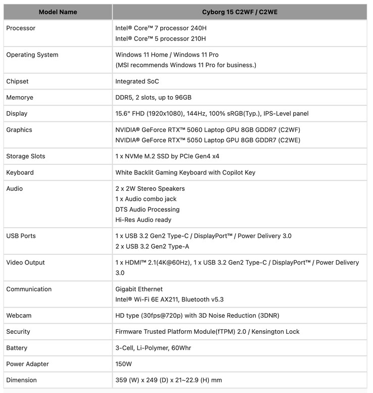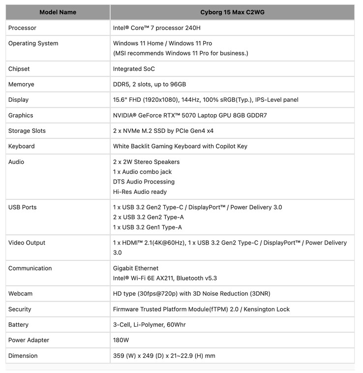 Allo stesso tempo, MSI ha aggiornato il Crosshair 16 HX con le varianti E14WGK, E14WFK e E14WEK che sfruttano il Core i7 14650HX o Core i9-14900HX e le versioni da 8 GB della GeForce RTX 5050, GeForce RTX 5060 o GeForce RTX 5070. Inoltre, MSI ha rivelato anche tre nuovi computer portatili Cyborg da 15 pollici, chiamati Cyborg 15 Max, C2WG Cyborg 15 C2WF e Cyborg 15 C2WE, con specifiche simili ai modelli dello scorso anno (attualmente 1.299 dollari su Amazon). MSI non ha però ancora confermato i prezzi e la disponibilità dei nuovi modelli. Consulti il comunicato stampa dell'azienda https://www.msi.com/news/detail/MSI-Unveils-New-Raider-and-Crosshair-Gaming-Laptops-with-Up-to-300W-Combined-Power--Delivering-Industry-leading-Performance--148460 per maggiori dettagli.