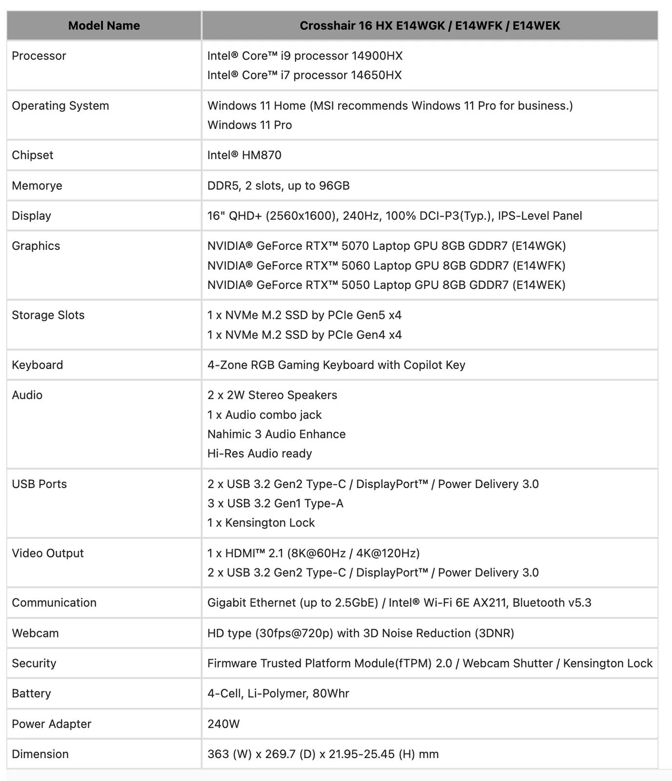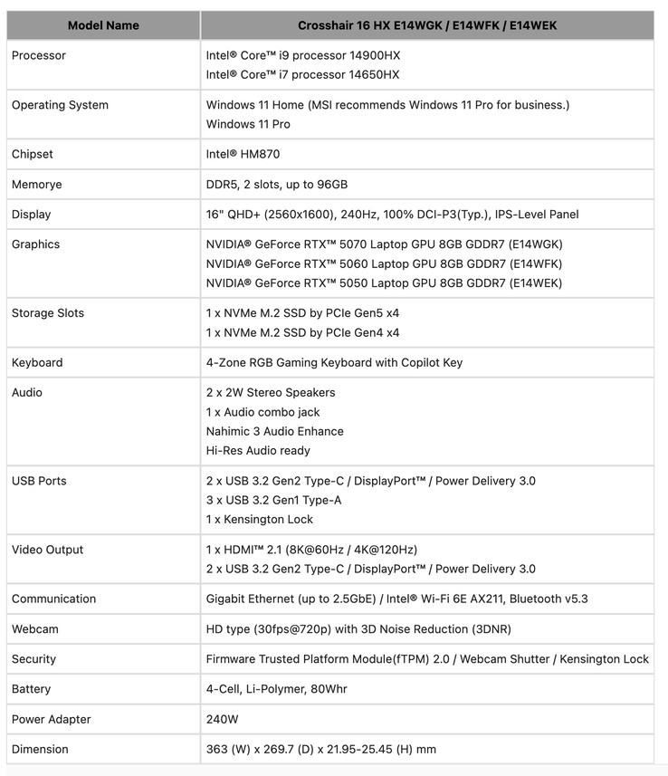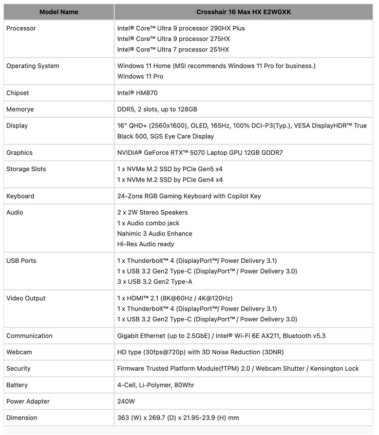 Tra l'altro, il Crosshair 16 Max HX E2WGXK è il primo computer portatile di cui è stato confermato il lancio con la RTX 5070 da 12 GB di Nvidia non ancora rilasciata RTX 5070 da 12 GB per laptop GPU. Nel frattempo, gli altri sette computer portatili elencati sopra sono dotati della GPU GeForce RTX 5070 Ti, GeForce RTX 5080 o GeForce RTX 5090.