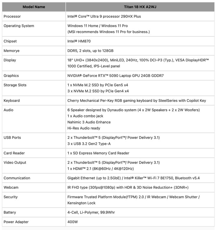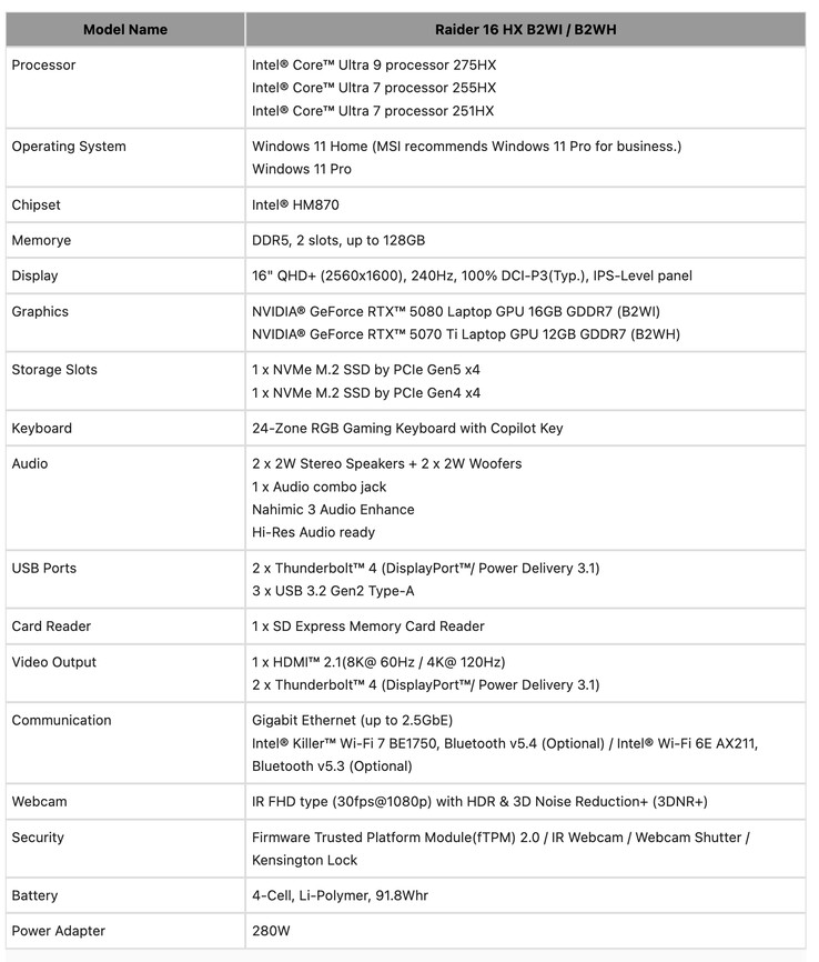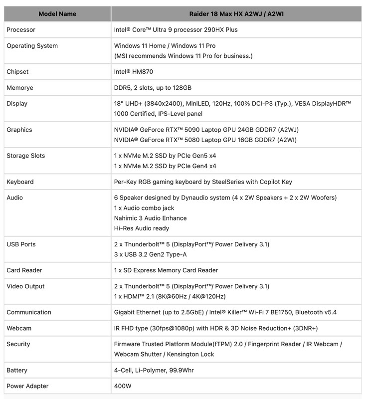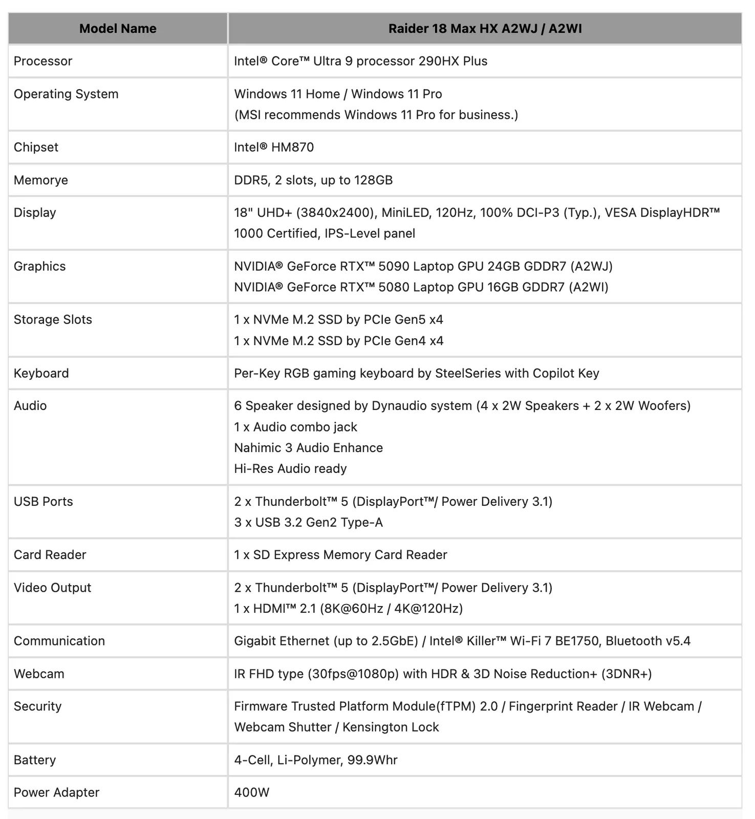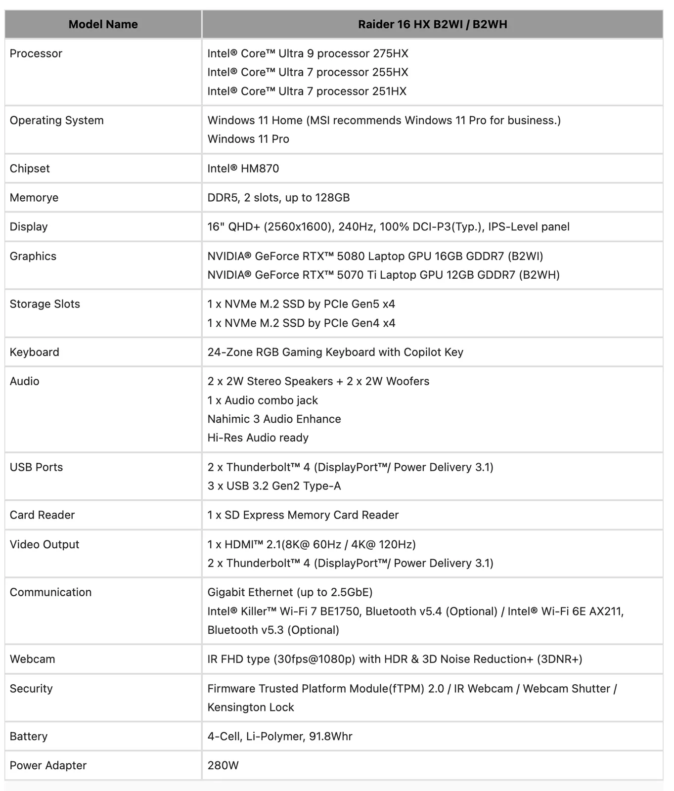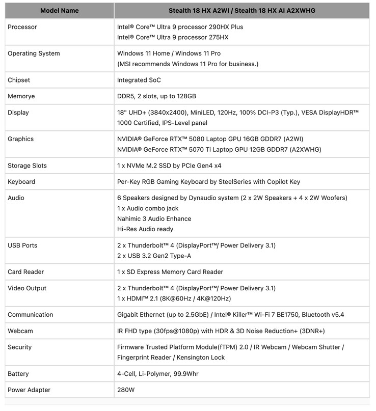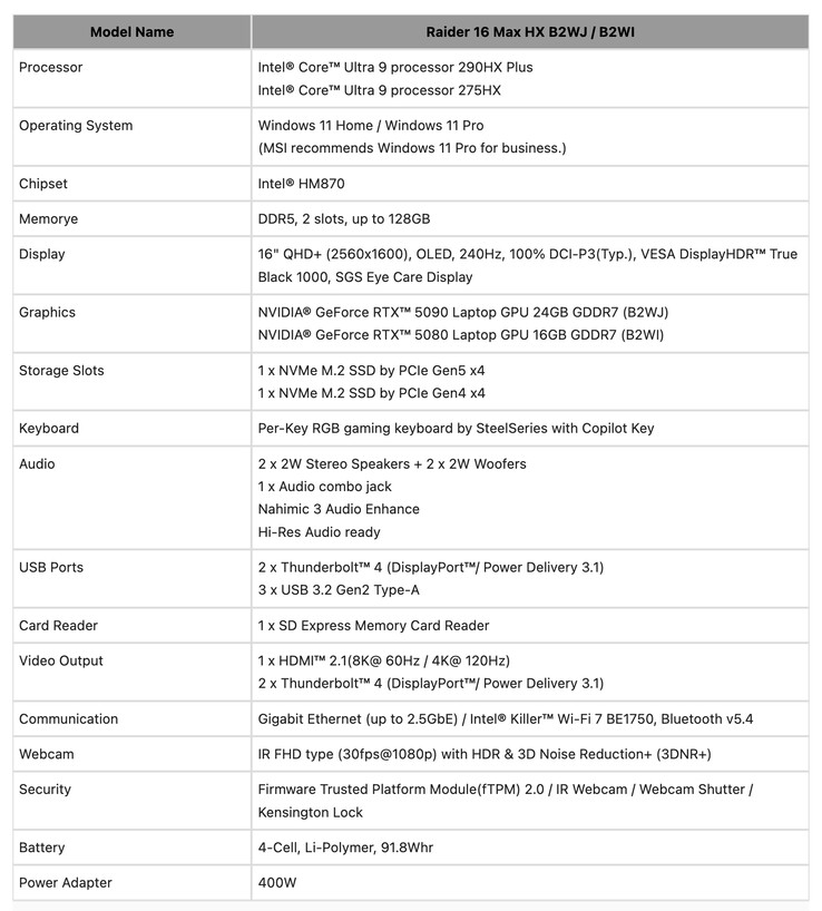 Ora, MSI si è unita alla festa con otto nuovi laptop della serie Raider e Stealth Titan. In particolare, l'azienda ha presentato i seguenti laptop supportati da Core Ultra 9 290HX Plus processori: