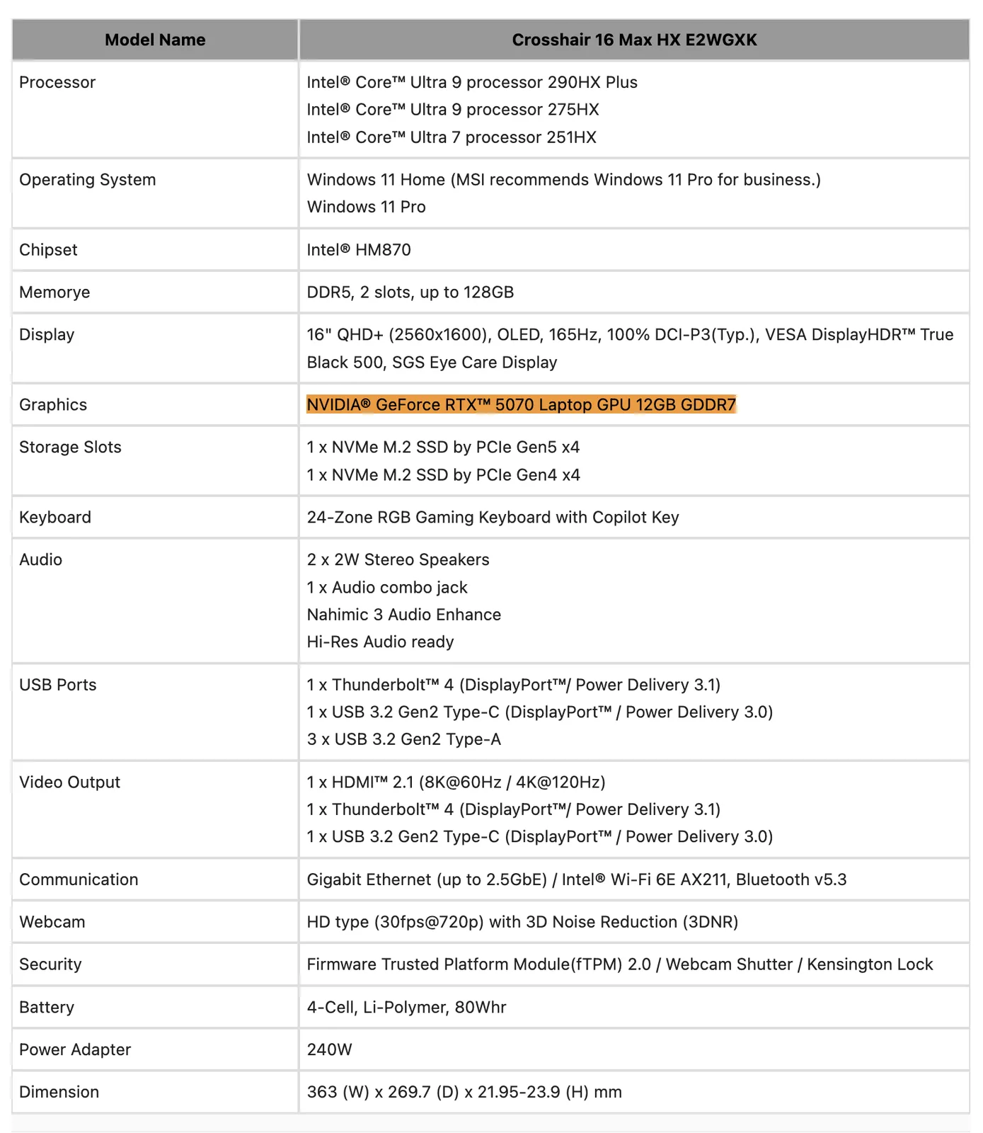 L'annuncio di oggi contiene anche un riferimento a una GPU che Nvidia non ha ancora rivelato ufficialmente. In particolare, MSI menziona che il suo Crosshair 16 Max HX E2WGXK sarà disponibile esclusivamente con la 'GPU Nvidia GeForce RTX 5070 Laptop 12GB GDDR7'.