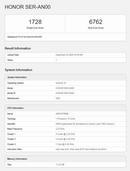 Il dispositivo testato è elencato con l'identificativo "Honor SER-AN00" ed è dotato di 12 GB di RAM. Dal punto di vista delle prestazioni, il Dimensity 8500 non sembra superare in modo significativo il Dimensity 8400 Dimensity 8400. Il chipset offre un punteggio single-core di 1.728 nella sua migliore esecuzione, e un punteggio multi-core di 6.762. In confronto, il Dimensity 8400 ottiene un punteggio medio di 1.621 e 6.208 su questi stessi test.