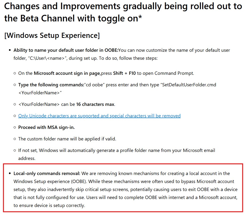 Nelle versioni precedenti, l'azienda ha bloccato il popolare comando OOBEbypassnro, che permetteva agli utenti di saltare una parte del processo di configurazione iniziale. Questo permetteva alla fine di creare un account offline. Ora, Microsoft ha raddoppiato la sua posizione.