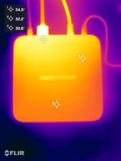 (±) 3: The average temperature for the upper side is 35.7 °C / 96 F, compared to the average of 32.5 °C / 91 F for the class Mini PC.