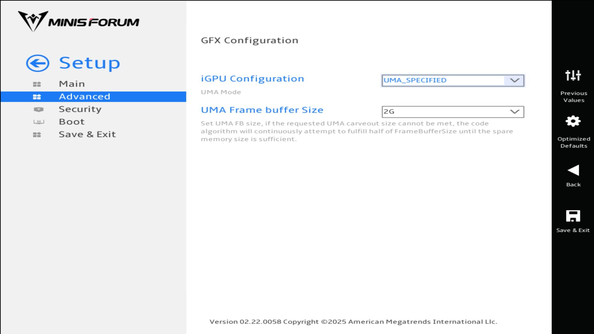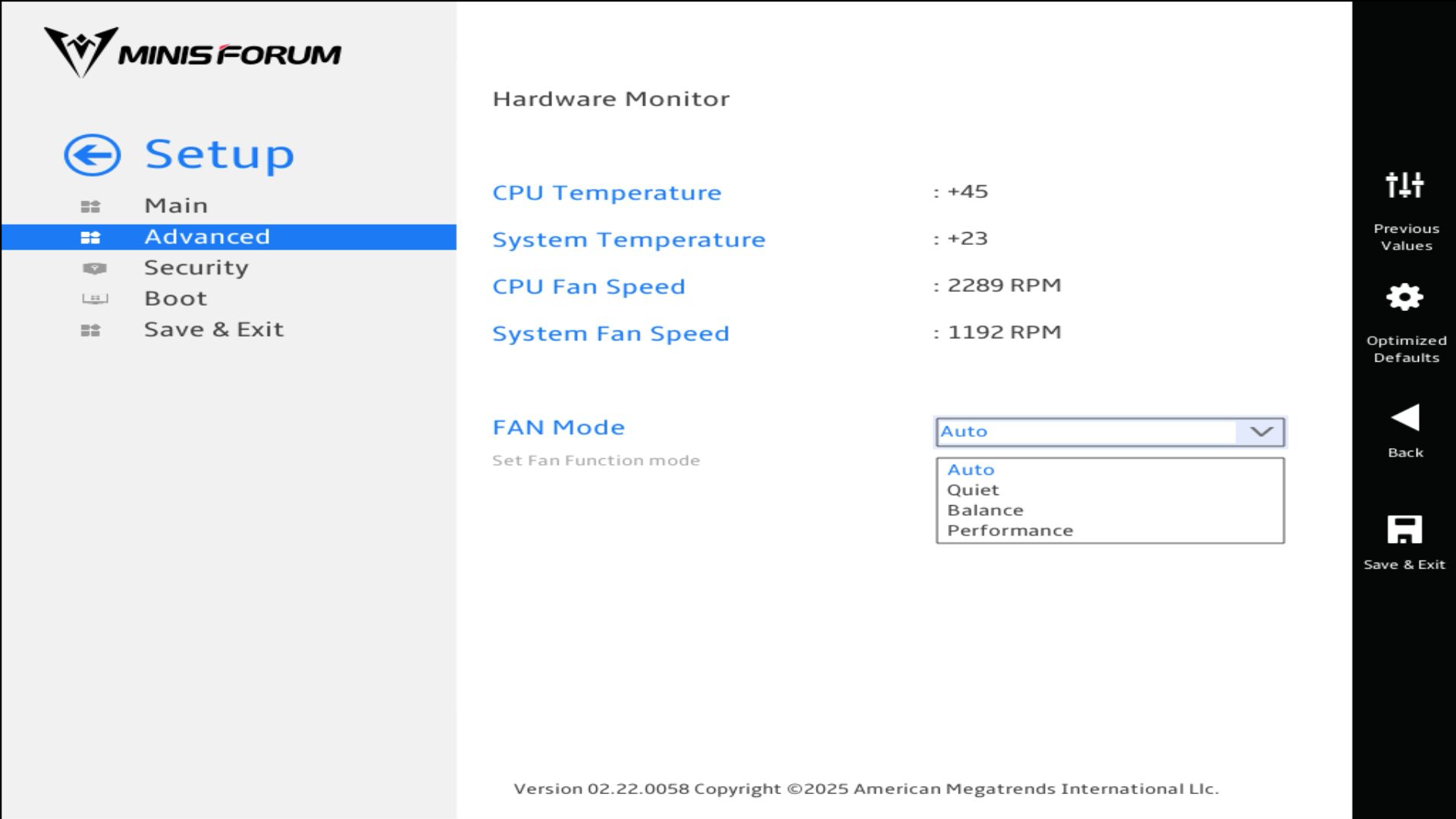 Tutti i test sulle prestazioni di Minisforum AI X1 sono stati eseguiti con le impostazioni di fabbrica. Nell'UEFI, Minisforum consente anche di personalizzare sia il profilo delle prestazioni del processore che il controllo della ventola.