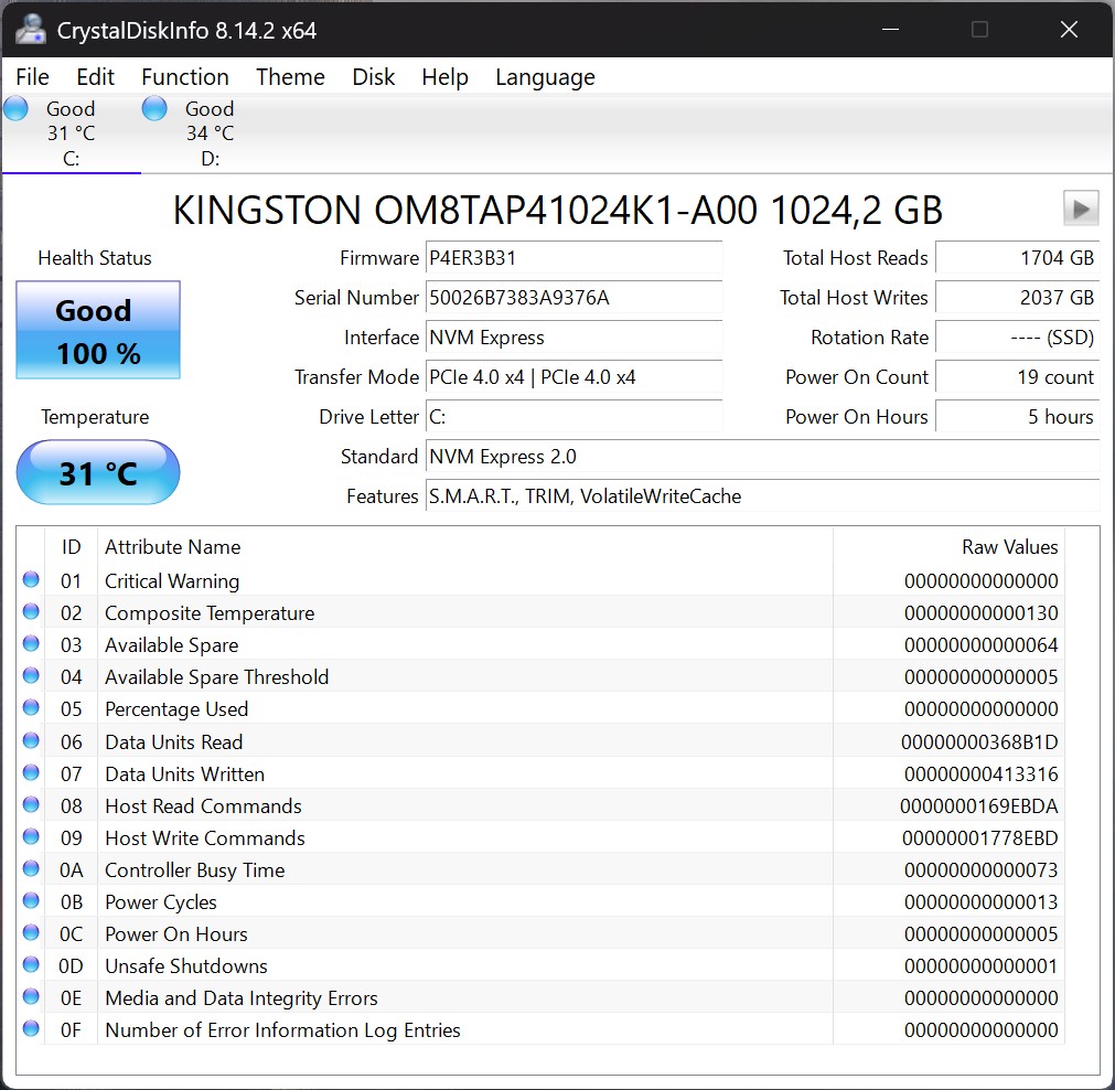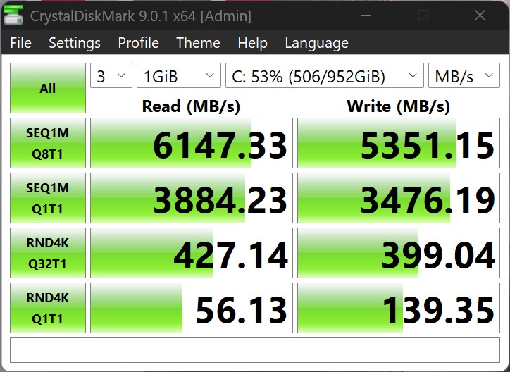 Il Minisforum AI X1 utilizza un SSD da 1 TB di Kingston con connessione PCIe 4.0 x4, che offre velocità di trasferimento affidabili, anche se non eccezionali. Il raffreddamento attivo assicura inoltre una prestazione sempre stabile e previene i cali durante il carico prolungato. Ci sono due slot M.2 disponibili per l'archiviazione, ma quando l'adattatore OCuLink è in uso, solo uno di essi può essere occupato.