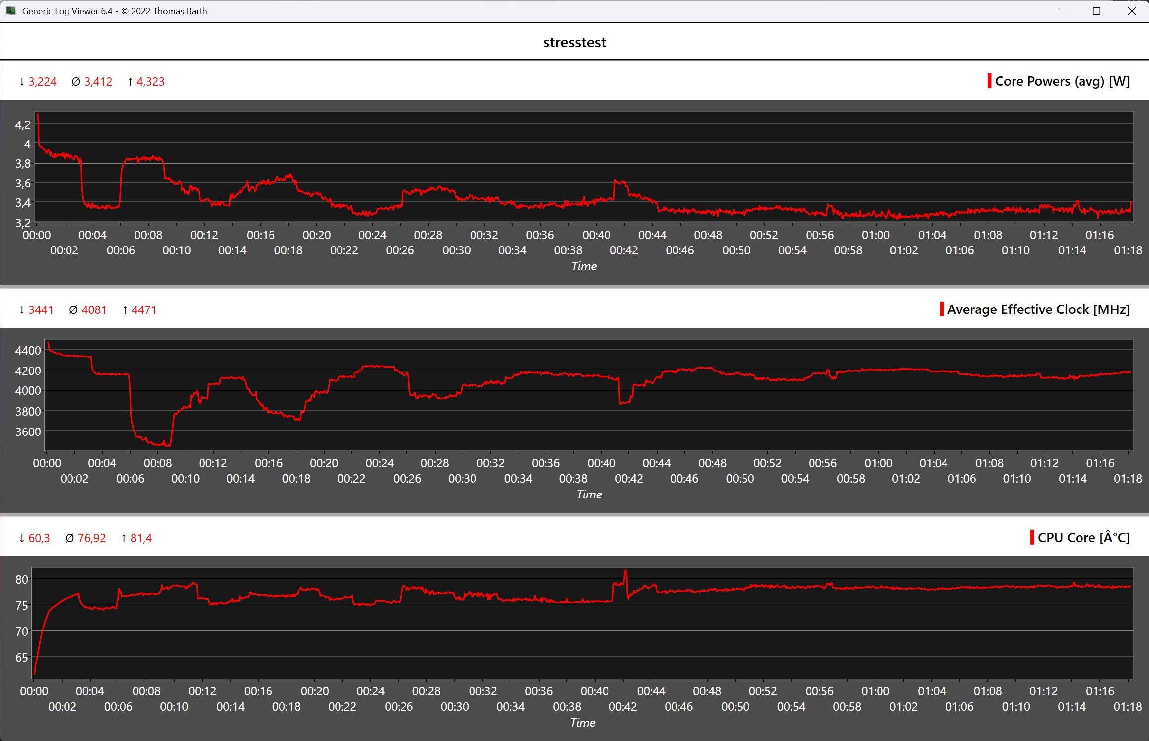 Nel primo stress test più lungo con il ciclo continuo Cinebench R15, il Minisforum AI X1 mostra che l'AMD Ryzen 7 255 non subisce alcun calo significativo delle prestazioni anche per periodi di tempo più lunghi. L'analisi dei dati telemetrici dimostra che il SoC può funzionare con un carico continuo fino a 54 watt. La temperatura di Ryzen 7 255 si stabilizza a circa 88 C.