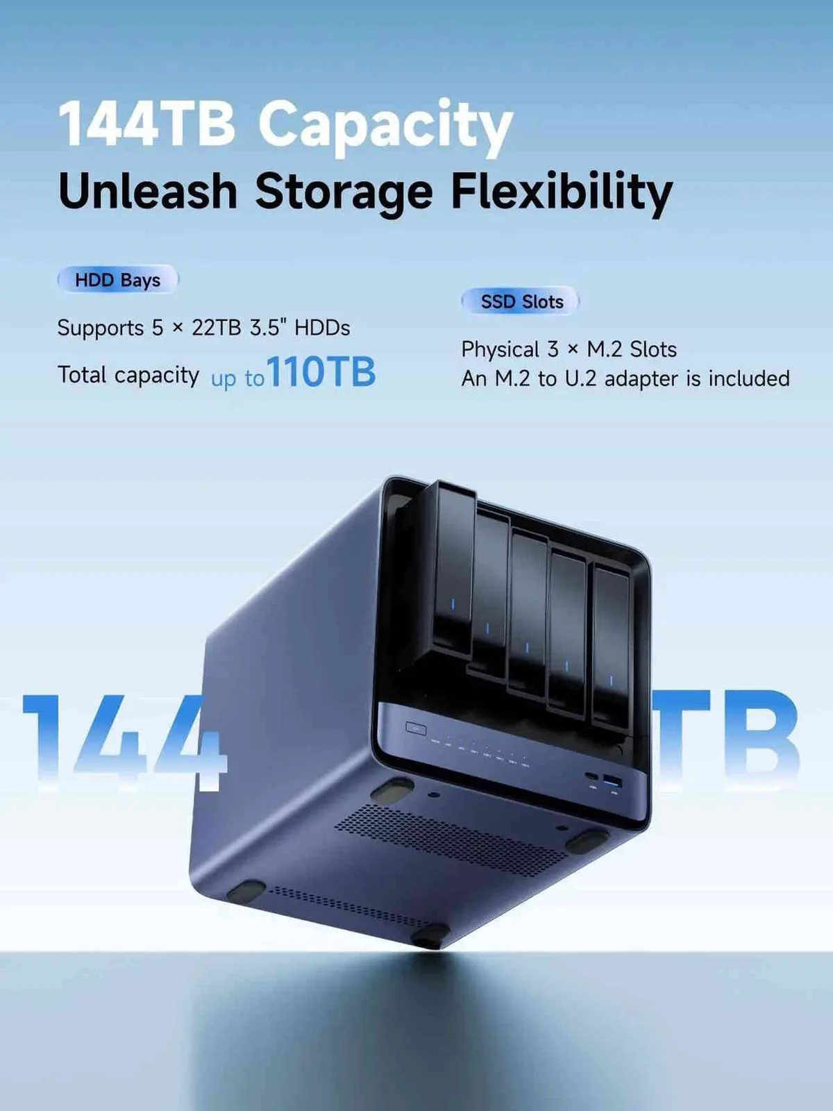 Minisforum N5 Air offre cinque alloggiamenti per HDD tradizionali e tre slot M.2 per SSD NVMe. Un adattatore incluso consente agli utenti di installare unità U.2 negli slot M.2. La connettività di rete è gestita da due porte Ethernet con capacità fino a 5 Gbit/s e 10 Gbit/s, rispettivamente. Il dispositivo NAS supporta la Link Aggregation, anche se l'hardware di rete esistente deve essere sufficientemente veloce per evitare colli di bottiglia significativi altrove.