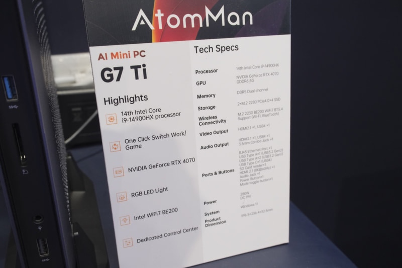 AtomMan G7 Ti dispone di una solida varietà di porte, tra cui USB 4.0, USB 3.1, 2x USB 3.0, HDMI 2.1, un lettore di schede SD https://www.amazon.com/SanDisk-128GB-Extreme-UHS-I-Memory/dp/B09X7FXHVJ?tag=nbcnewsnet-20 (standard non specificato) e gigabit ethernet. La DisplayPort è purtroppo assente, per cui gli utenti dovranno accontentarsi della singola porta HDMI 2.1. Per quanto riguarda la connettività wireless, sono stati inclusi il WiFi 7 e il Bluetooth 5.4. Al momento, non sappiamo molto sul suo costo o sulla sua disponibilità, ma ci assicureremo di trasmettere tutte le informazioni rilevanti quando saranno disponibili.