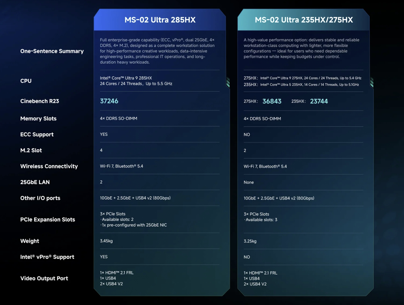 Al momento, l'MS-02 Ultra parte da 949 dollari come unità "barebone" con un Core Ultra 9 275HX prima di applicare uno sconto di 50 dollari al momento del pagamento, utilizzando il codice MS0250. Tuttavia, un modello più economico Core Ultra 5 235HX più economica sarà disponibile a 719 dollari. Nel frattempo, il Core Ultra 9 285HX parte da 1.119 dollari e arriva a 2.899 dollari con 192 GB di RAM ECC e un SSD da 2 TB. Tenga presente che solo il Core Ultra 9 285HX contengono due porte Ethernet da 25 Gbps.
