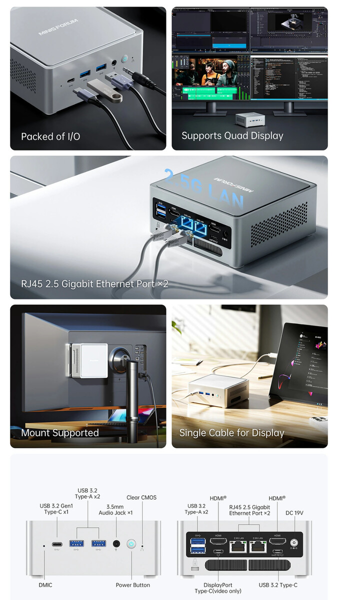 Inoltre, il NAB3R supporta l'aggiornamento dello storage e della RAM, anche se solo fino a 64 GB di DDR4-3200 nel secondo caso. Tuttavia, Minisforum ha incluso una soluzione di raffreddamento attivo per l'SSD M.2 2280 del mini-PC, oltre a una grande ventola turbo sul lato inferiore. Come mostra l'immagine sottostante, il NAB3R non è privo di porte nemmeno sul lato posteriore.