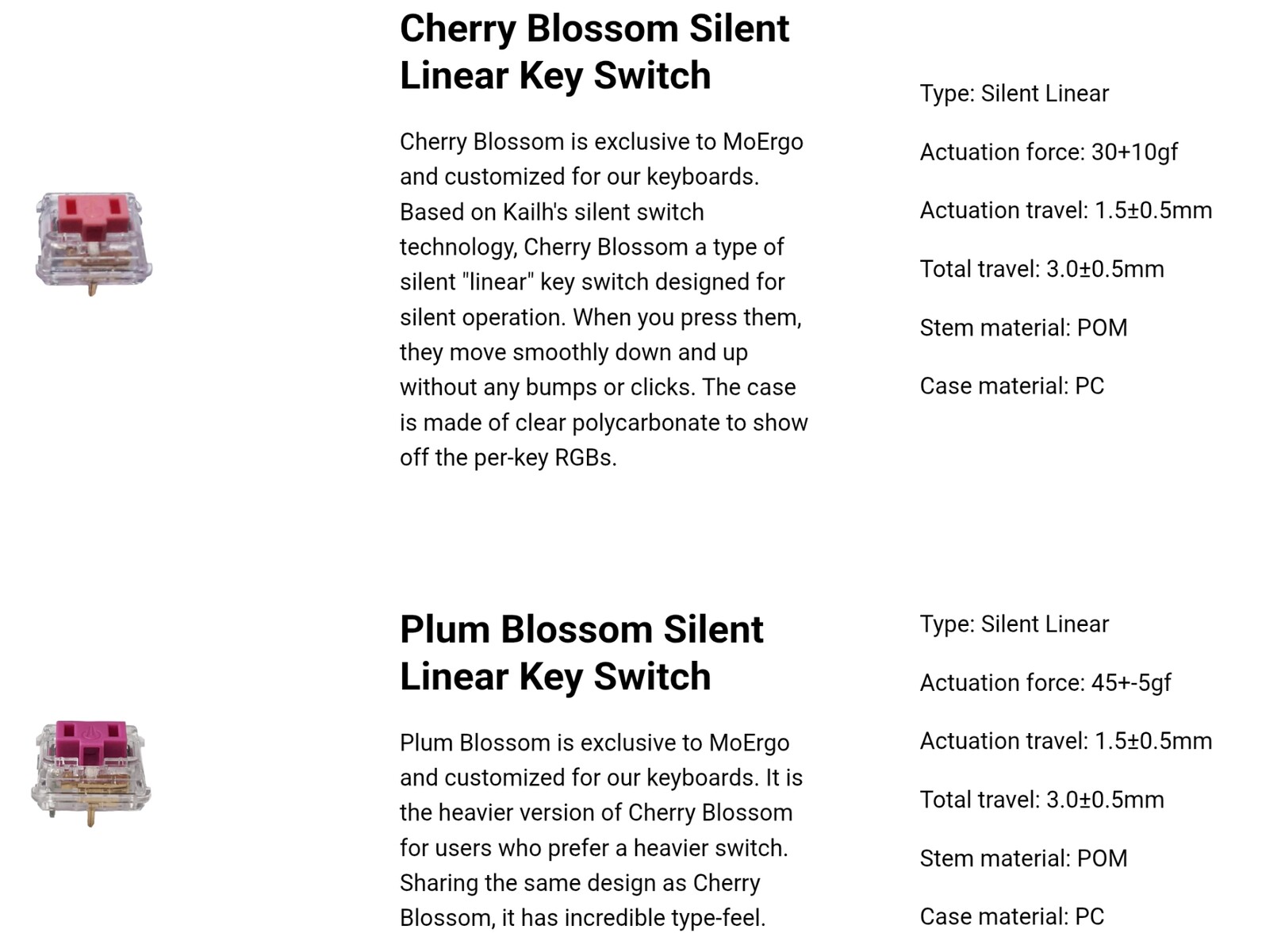 Per cominciare, la nuova tastiera presenta interruttori Kailh Choc V1 a basso profilo sostituibili a caldo, ma questa volta è dotata di interruttori silenziosi Cherry Blossom, che sono un'esclusiva di MoErgo e della Go60 in particolare. Come il Glove80 originale, il Go60 è dotato di copritasti in POM, che aggiunge una sensazione premium e una migliore resistenza chimica rispetto a materiali come l'ABS e persino il PBT.