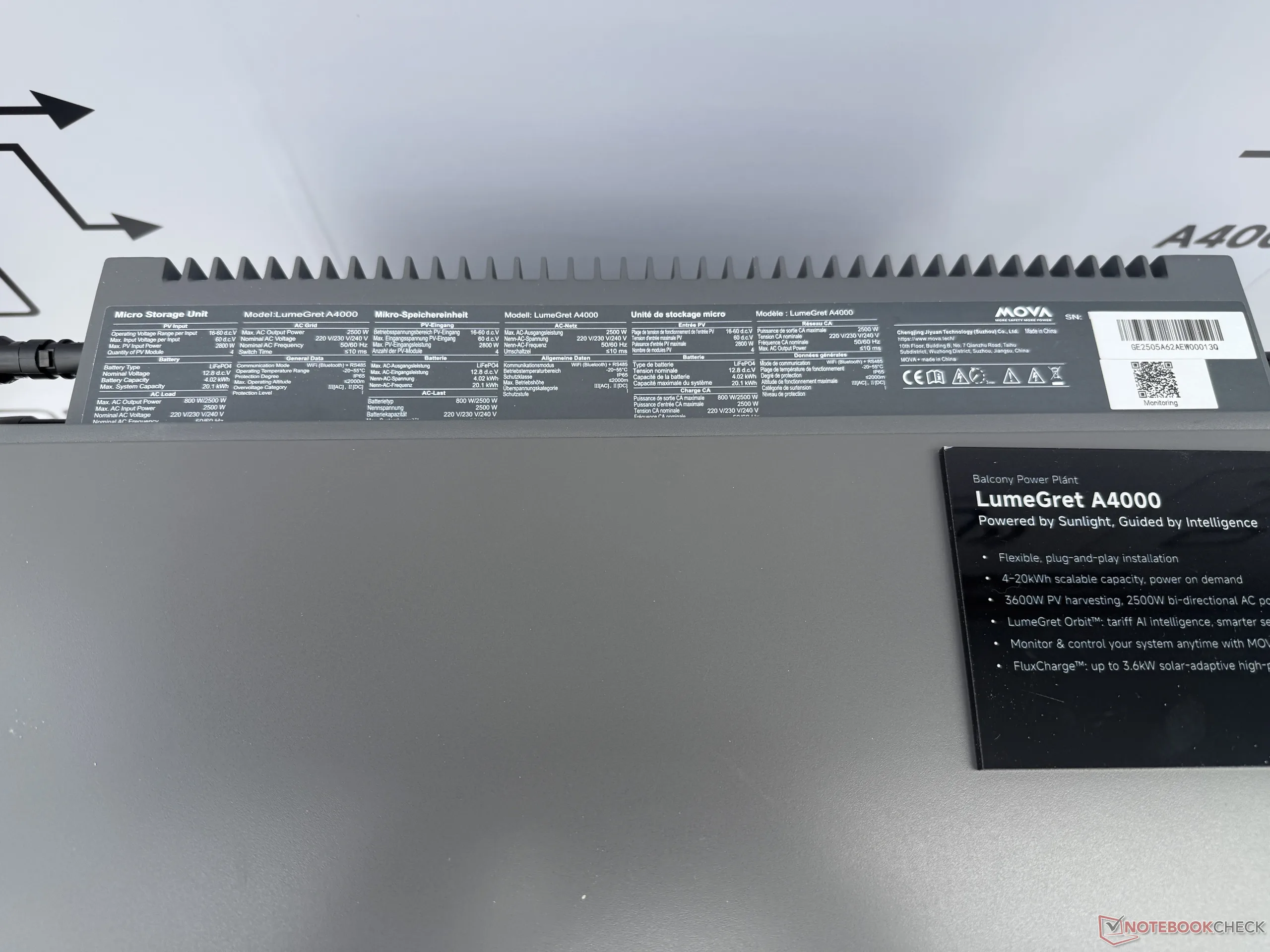 Per contro, Mova afferma che LumeGret A2000 si concentra su una maggiore sicurezza, con un sistema di protezione esteso che include una funzione di soppressione degli incendi con aerosol. Di conseguenza, la sua capacità è inferiore e va da 1,92 a 9,6 kWh.