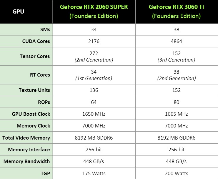 Secondo NVIDIA, la RTX 3060 Ti supporta le principali tecnologie GeForce tra cui DLSS, NVIDIA Reflex e NVIDIA Broadcast insieme al ray-tracing in tempo reale. Con 38 Multiprocessori Streaming (SM), la RTX 3060 Ti offre quattro SM in più rispetto alla RTX 2060 Super. La 3060 Ti dispone di 4.864 CUDA cores, 152 tensor cores di terza generazione e 38 cores RT di seconda generazione. La GPU ha un clock boost di 1.665 MHz.