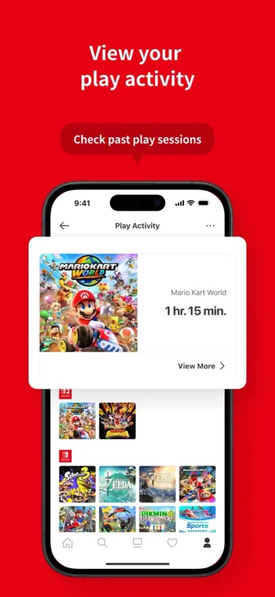 Tuttavia, Nintendo ha smesso di registrare i dati per Wii U e 3DS nel febbraio 2020, quindi l'app può visualizzare solo i dati storici raccolti prima di tale data. L'app suddivide anche i tempi di gioco, mostrando per quanto tempo gli utenti hanno giocato in ogni giorno