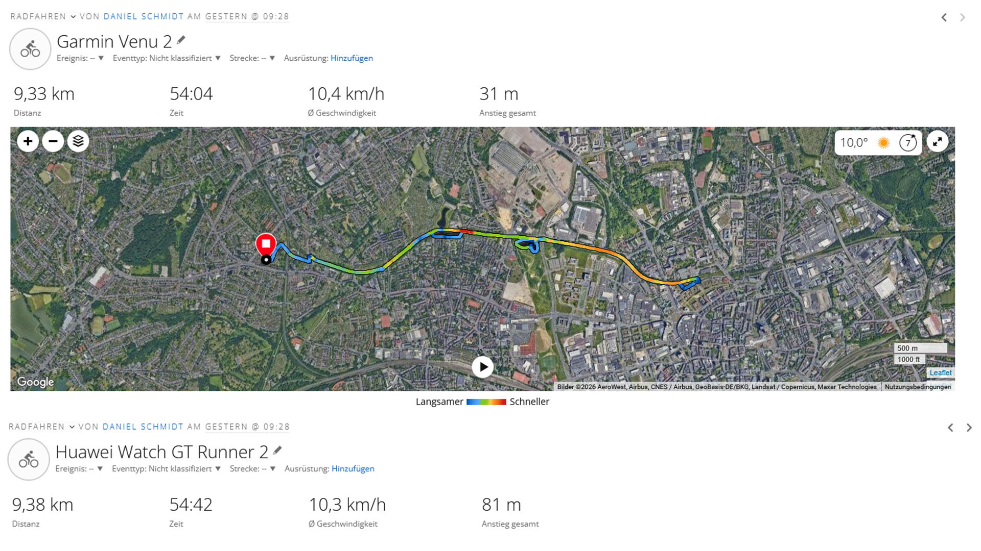 Abbiamo misurato la frequenza cardiaca durante una corsa in bicicletta, confrontando l'orologio Huawei con una fascia toracica Polar H10. Mentre le letture della frequenza cardiaca a riposo sono identiche, i valori mostrano una maggiore variazione durante l'esercizio fisico; in media, si tratta solo di quattro battiti e di sei battiti al picco della frequenza cardiaca. L'orologio GT Runner 2 fornisce costantemente i valori più bassi.