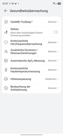 Come di consueto, lo smartwatch Huawei rileva automaticamente un'ampia gamma di metriche sulla salute e consente anche il rilevamento manuale. Queste includono la frequenza cardiaca, l'analisi delle onde del polso, la saturazione di ossigeno nel sangue (SpO2), i livelli di stress o di benessere, la variabilità della frequenza cardiaca (HRV) e la temperatura della pelle. Quest'ultima può essere utilizzata per il monitoraggio del ciclo. È anche possibile misurare manualmente la rigidità arteriosa e creare ECG. È tornata anche la funzione di monitoraggio del sonno TruSleep.