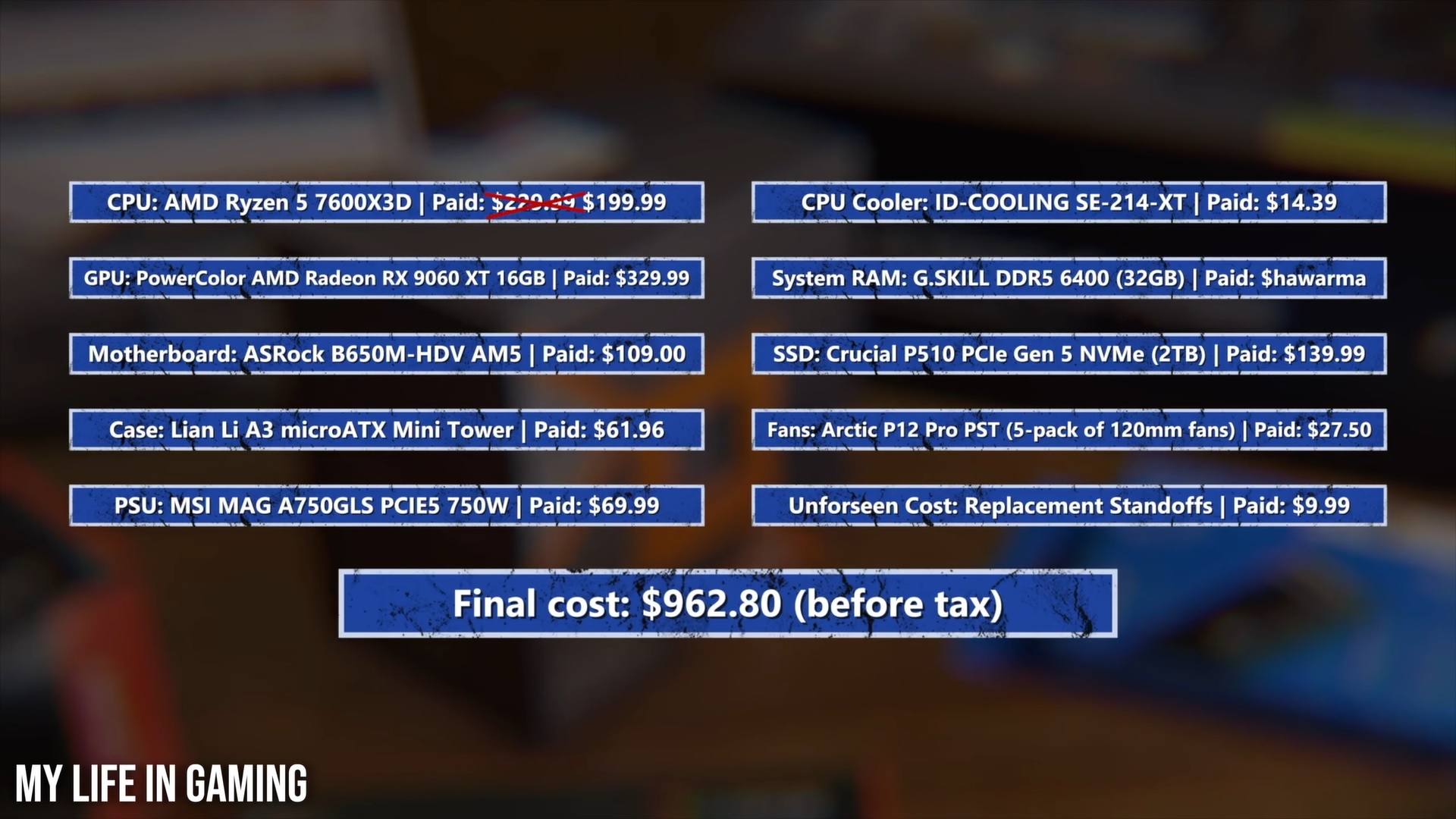 DF ha mostrato una costruzione di PC equivalente a PS5 Pro del canale YouTube My Life In Gaming. Il prezzo della costruzione è stato di 963 dollari con una RX 9060 XT da 16 GB, un Ryzen 5 7600X3D e 2 TB di memoria. Tuttavia, il PC da gioco non includeva il prezzo della memoria DDR5-6400 da 32 GB utilizzata.