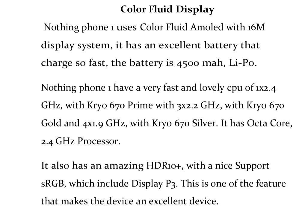 Il contenuto riprodotto indica che Nothing è diventato ancora meno fantasioso di quanto pubblicizzato con il suo branding, accennando per esempio a "Color Fluid Display" marketing che sarebbe, se accurato, un diretto e piuttosto egregio knock-off di OnePlus' identità del marchio OnePlus.