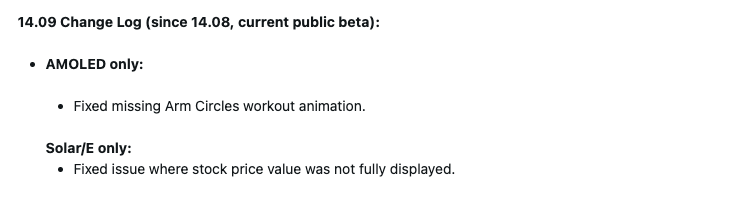 Il nuovo rilascio della versione beta 14.09 è relativamente minore e apporta due correzioni di bug agli utenti dell'Instinct 3 e degli smartwatch correlati. Per l'Instinct 3 AMOLED, Garmin ha aggiunto l'animazione di allenamento Arm Circles, che prima mancava. Solo per gli smartwatch Instinct 3 Solar e Instinct E c'è una correzione di bug legata al nuovo Stocks Glance. È stato risolto un problema che poteva causare la visualizzazione parziale del valore del prezzo delle azioni.