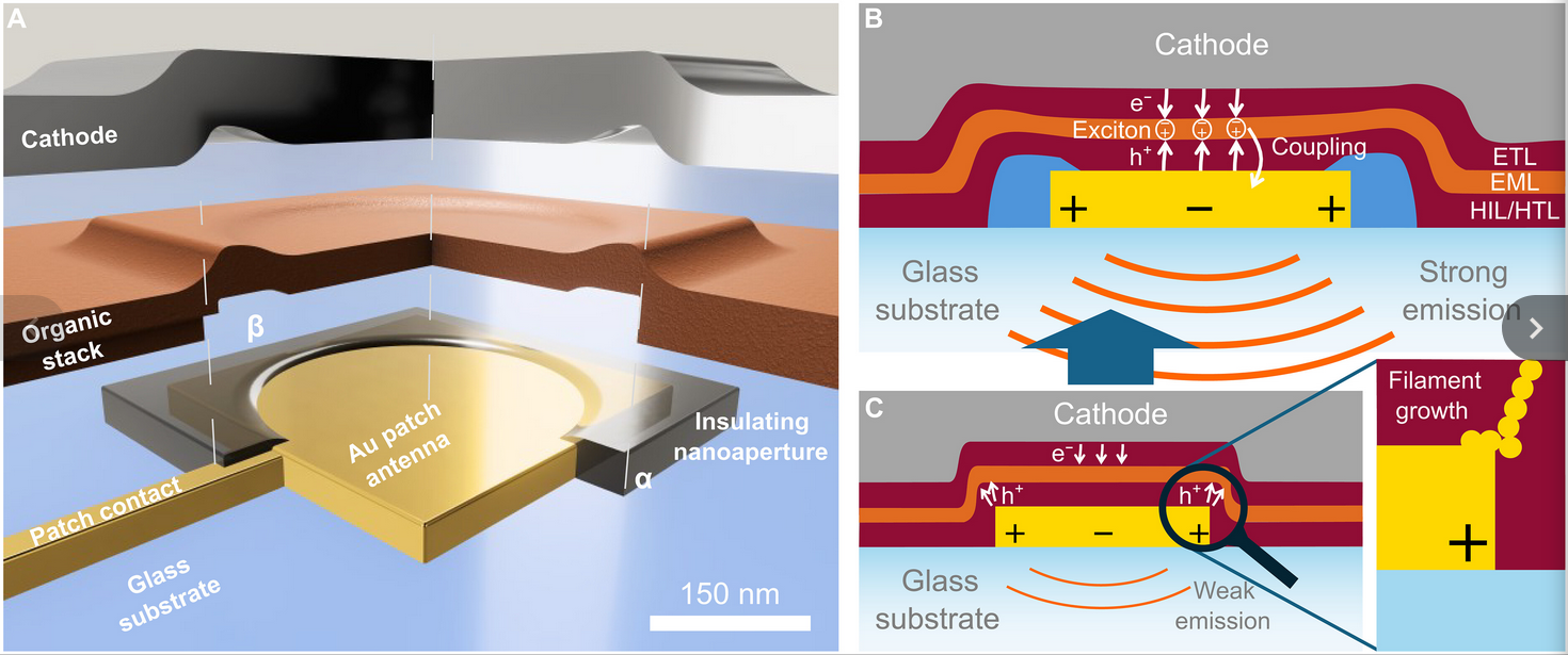 I ricercatori tedeschi hanno pubblicato i loro risultati sulla rivista Science Advances, dove notano che il pixel da 300 nm² emette luce arancione ed è altrettanto luminoso di un OLED convenzionale da 5 nm². Tuttavia, il semplice rimpicciolimento del diodo emettitore di luce non consentirebbe un'efficienza affidabile. Gli scienziati dovevano implementare un'antenna cuboide d'oro di 300 x 300 x 50 nm e dovevano anche assicurarsi che le correnti del campo elettrico non costringessero gli atomi d'oro a ramificarsi nel materiale otticamente attivo, mandando in corto circuito l'intera struttura del pixel. Per questo, i ricercatori hanno progettato uno strato isolante in cima all'antenna, che lascia un'apertura circolare con un diametro di 200 nm al centro dell'antenna.