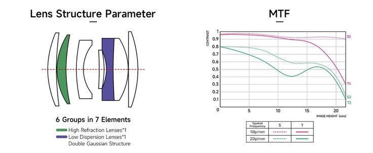 Per rendere possibile il prezzo basso, Brightin Star opta per una costruzione dell'obiettivo relativamente semplice, con 7 elementi in 6 gruppi, rinunciando completamente alle lenti asferiche o con correzione apocromatica. Come mostrano le curve MTF del produttore, l'obiettivo rende pochissimi dettagli ai bordi del fotogramma alla massima apertura. L'obiettivo è nitido solo al centro dell'immagine, il che dovrebbe renderlo adatto ai ritratti, tra gli altri scenari.