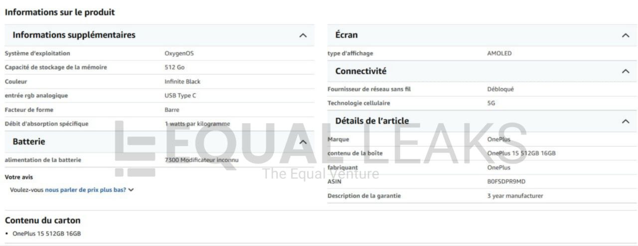 Inoltre, un primo annuncio da Amazon Francia - individuato da Equal Leaks - indica che la versione globale di OnePlus 15 manterrà la stessa capacità della batteria da 7.300 mAh del modello cinese. La stessa fonte ha anche individuato un annuncio per il modello OnePlus 15 da 16 GB di RAM + 512 GB su Amazon UK con un prezzo di 949 sterline. Ci si può aspettare anche una versione più economica con 12GB di RAM + 256GB di storage, nonché una variante top con fino a 1TB di storage.