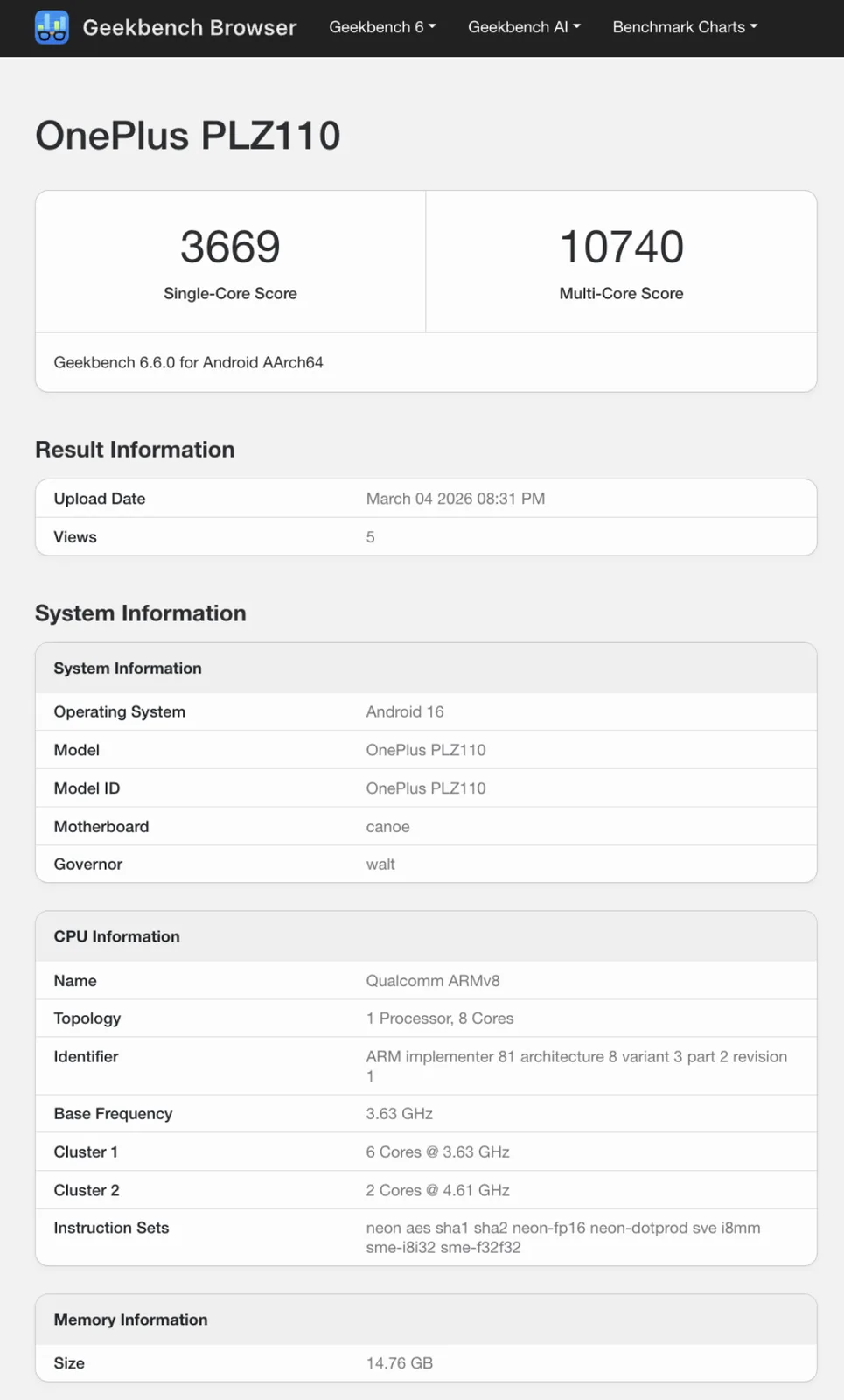 Ora, quello che sembra essere lo stesso dispositivo è apparso su Geekbench in alcuni elenchi. Come previsto, il OnePlus 15T corrisponde al OnePlus 15 con uno Snapdragon 8 Elite Gen 5 e 16 GB di RAM. Attualmente, il OnePlus 15 è uno dei chipset Snapdragon 8 Elite Gen 5 che abbiamo testato finora.