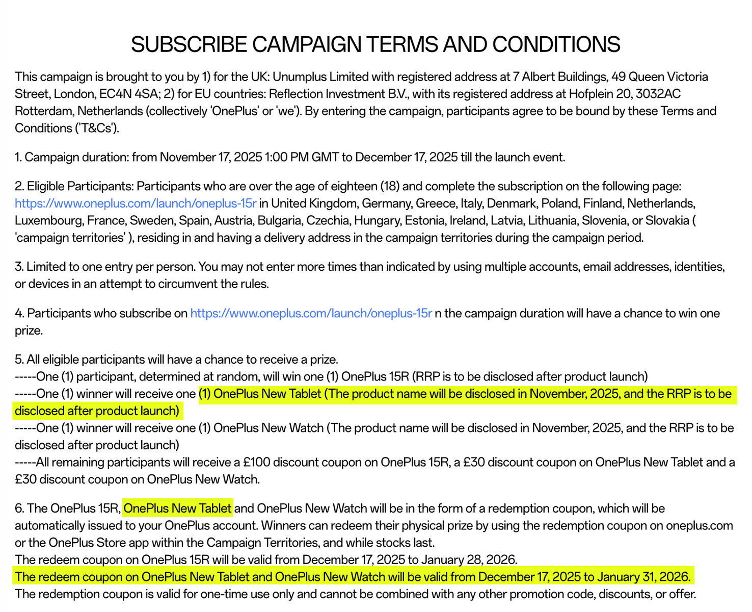 Invece, OnePlus menziona un 'nuovo tablet OnePlus' nei termini della campagna promozionale di OnePlus 15R. Come mostra lo screenshot qui sotto, OnePlus rivelerà il nome di questo misterioso tablet alla fine del mese. Inoltre, gli stessi termini indicano che OnePlus rilascerà lo stesso tablet intorno al 17 dicembre, prima che la campagna early bird termini il 31 gennaio 2026.