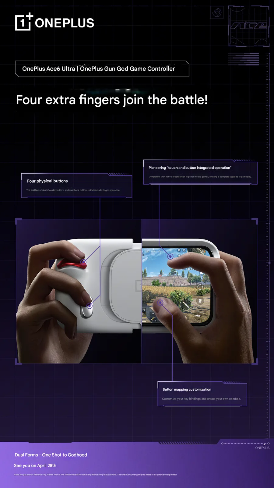 L'accessorio aggiunge quattro pulsanti fisici e incoraggia i controlli ibridi: tocco e pulsanti. OnePlus dimostra che con il controller collegato, i giocatori possono facilmente utilizzare più dita per giocare ai giochi di tiro sull'Ace 6 Ultra. Questa configurazione, come mostrano i video, rende più facile eseguire azioni FPS complesse come sbirciare, mirare, sparare e controllare il rinculo allo stesso tempo.