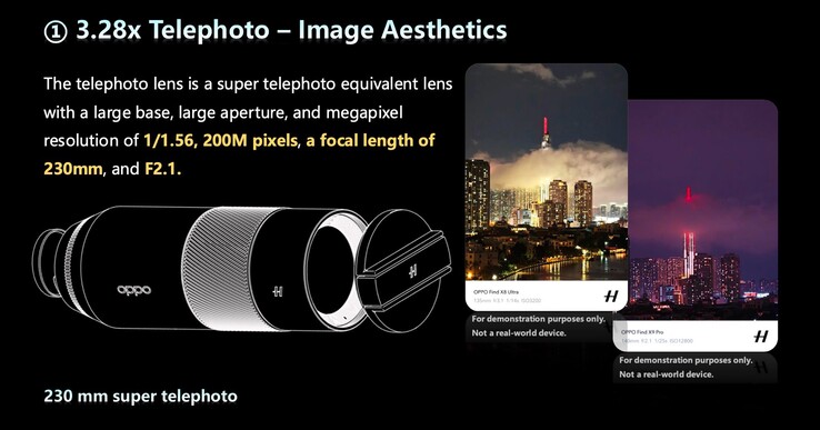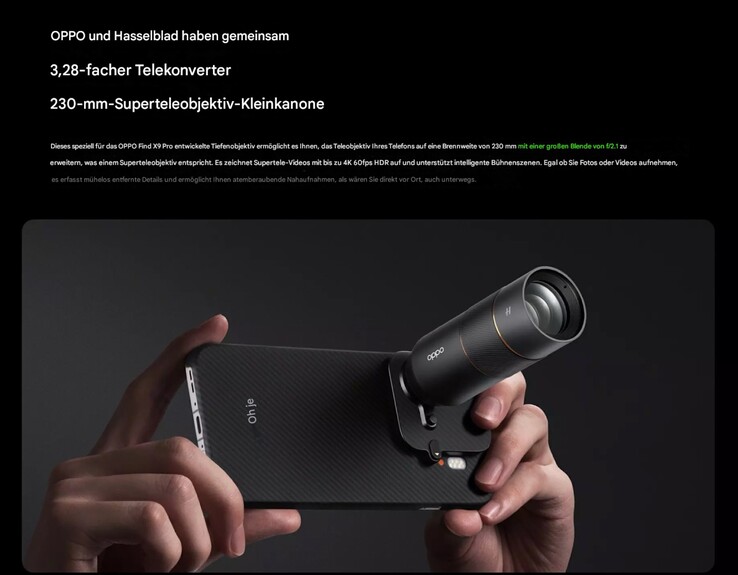 Questa fotocamera con teleobiettivo presenta una lunghezza focale equivalente a 35 mm di 70 mm e un'apertura di f/2,1. Per coloro che desiderano una portata ancora maggiore, Oppo offre un convertitore teleobiettivo opzionale che aumenta effettivamente la lunghezza focale della fotocamera teleobiettivo periscopica a 230 mm (equivalente a 35 mm), dando allo smartphone uno zoom ottico 10x.