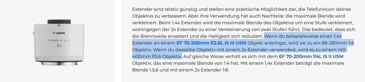 I produttori di fotocamere come Canon dimostrano che il marketing può anche essere più onesto. Quando si tratta di teleconvertitori per fotocamere di sistema, in genere spiegano e specificano chiaramente come il convertitore influisce sulla lunghezza focale e sull'apertura di un obiettivo. Ad esempio, un obiettivo 70 mm f/2,8 diventa un 98 mm f/4 con un teleconvertitore 1,4x, ma un 140 mm f/5,6 con un convertitore 2x. Quindi, per uno zoom doppio, si perdono due interi f-stop di luce.