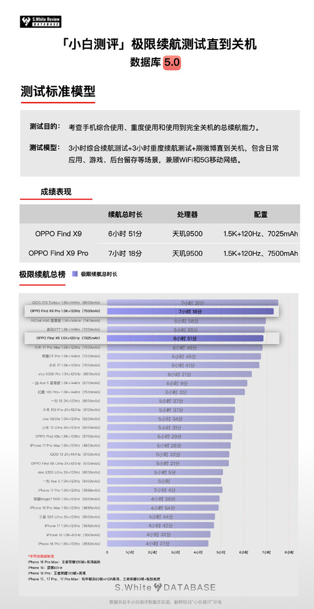 Il Find X9 Pro riesce a raggiungere un tempo totale di 7h18m nel test, perdendo solo rispetto all'iQOO Z10 Turbo+, che dura 7h31m. L'Oppo ha una batteria da 7.500 mAh, proprio come lo Xiaomi 17 Pro Max-mentre l'iQOO ha un'unità da 8.000 mAh. Ad accentuare ulteriormente le prestazioni non ottimali della batteria di Xiaomi, il Find X9 vaniglia dura 6h51m contro le 6h49m dello Xiaomi 17 Pro Max, nonostante abbia una batteria più piccola da 7.025 mAh. Va notato, tuttavia, che il Find X9 è anche il dispositivo più piccolo dei due. In particolare, l' iPhone 17 Pro Max dura 5h26m.